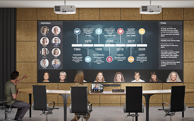 Laserová projekcia, ktorá sa opäť objavuje v konferenčných miestnostiach, poskytuje veľký, jasný a škálovateľný obraz s rozlíšením bez pixelov. Použitím dvoch alebo viacerých projektorov vedľa seba môžete dosiahnuť výnimočnú šírku a ideálny pomer strán pre preferované usporiadanie videokonferencií, či už ide o MTR Front Row alebo akúkoľvek inú platformu alebo usporiadanie. Projekcia je tiež diskrétna (žiadne čierne plátno, keď sa nepoužíva), nákladovo efektívna a všestranná.