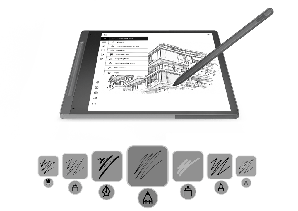 Súčasťou zariadenia je aktívne inteligentné pero stylus bez batérie, ktoré možno ľahko uložiť do puzdra. Toto inteligentné pero ku zariadeniu Lenovo Smart Paper netreba vôbec nabíjať a je vybavené plsteným hrotom a latenciou až 23 milisekúnd10, takže veľmi verne reprodukuje pocit písania zo skutočným perom. S jedným dotykovým perom si používatelia môžu vybrať z deviatich rôznych nastavení pera – vrátane guľôčkového pera, ceruzky (drevenej a mechanickej), fixky a dokonca aj kaligrafie – takže nemusia hľadať tú správnu písaciu pomôcku. So 4 096 úrovňami citlivosti na tlak a detekciou náklonu v pere, plus 74 šablón poznámkových blokov na výber (napríklad riadkovaný/čiarový, graf, prázdny papier a dokonca aj hudobný rukopis), používatelia môžu jednoducho písať, kresliť, skicovať, tieňovať a ilustrovať. s obrovskou precíznosťou.