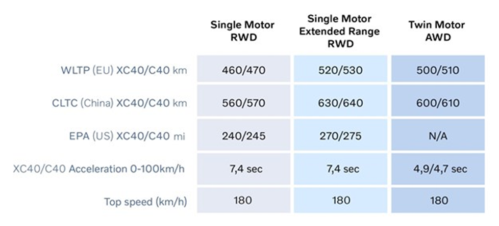Táto nová konfigurácia v spojení s akumulátorom s kapacitou 82 kWh a celkovým zlepšením účinnosti jeho chladenia je zárukou, že dvojmotorový model XC40 Recharge s pohonom všetkých kolies (Twin Motor AWD) teraz dosahuje dojazd až 500 kilometrov na jedno nabitie, čo je v porovnaní s predchádzajúcou verziou zlepšenie o 62 kilometrov. Dojazd dvojmotorového modelu C40 Recharge s pohonom všetkých kolies (Twin Motor AWD) sa predĺžil zo 451 kilometrov (WLTP) na 507 kilometrov.