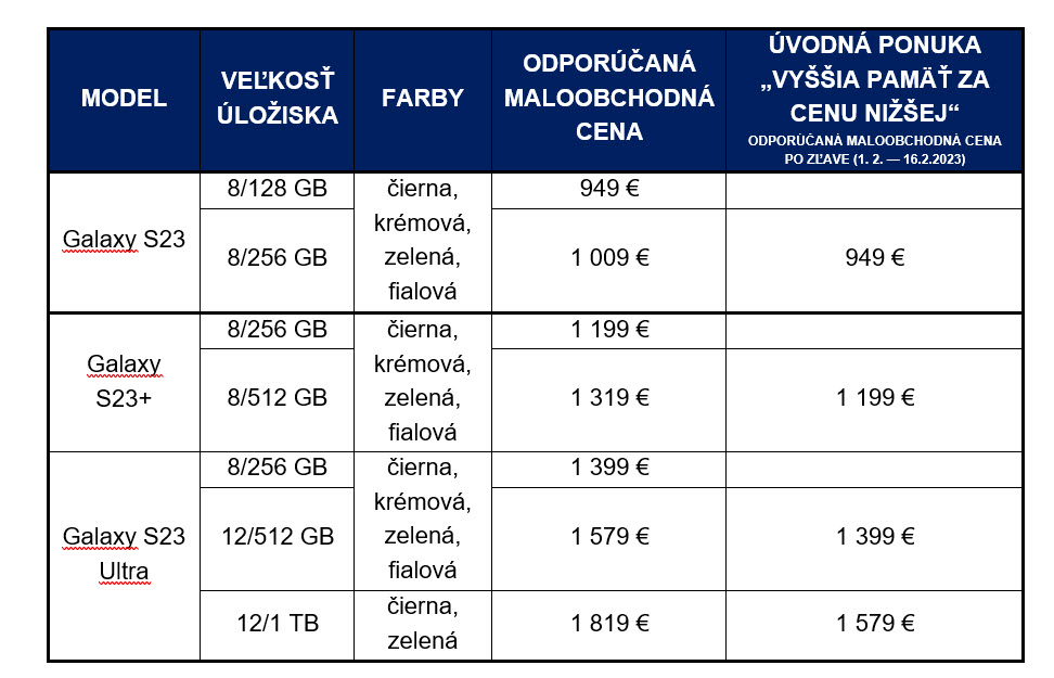 Zákazníci, ktorí si v období od 1. 2. do 16. 2. 2023 (vrátane) alebo do vypredania zásob kúpia mobilný telefón Galaxy S23, S23+ alebo S23 Ultra získajú model s dvojnásobne vyššou kapacitou pamäte za cenu modelu s nižšou kapacitou. Pri nákupe stačí zadať zľavový kód, v prípade nákupu v predajni zľavu uplatní predajca. Mechanizmus získania modelu s vyššou pamäťovou verziou za cenu modelu s nižšou pamäťovou verziou sa môže líšiť v závislosti od predajcu. Zároveň môžu záujemcovia po registrácii v aplikácii Samsung Members, v časti „Výhody“, odpredať svoje staré zariadenie a k výkupnej cene navyše získať výkupný bonus vo výške 120 €. Celkovo tak zákazníci v rámci úvodnej ponuky môžu získať bonusy v hodnote až 360 eur. Ďalšie informácie o výkupnom bonuse sú k dispozícii na www.novysamsung.sk.