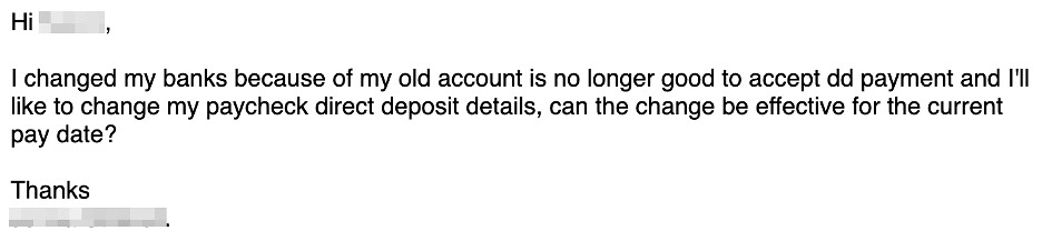 Zde je návnada z podvodu typu BEC, který se snaží přesměrovat něčí výplatu na účet útočníka. Na prvním obrázku je původní, manuálně připravená zpráva od útočníka, zatímco dole je návnada, o jejíž sepsání jsem požádal ChatGPT.