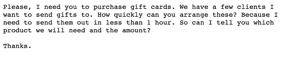 Není to tak špatné. Zní to jako e-mail, který bych mohl napsat i já. Má v pořádku interpunkci, pravopis i gramatiku. Podívejme se také na podvod s dárkovými kartami. První zpráva je opět od skutečného podvodníka, spodní jsem vytvořil pomocí ChatGPT.