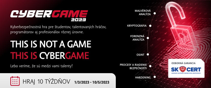 Druhý ročník slovenskej kyberbezpečnostnej súťaže CyberGame akcentuje hľadanie talentov pre oblasť kybernetickej bezpečnosti bez rozdielu veku. Scenáre sú inšpirované aktuálnymi udalosťami, keďže úlohy pripravujú aj profesionáli z Národného centra kybernetickej bezpečnosti SK-CERT. Odborným garantom súťaže je Národný bezpečnostný úrad. CyberGame 2023 sa hrá desať týždňov, od 1. marca do 10. mája.
