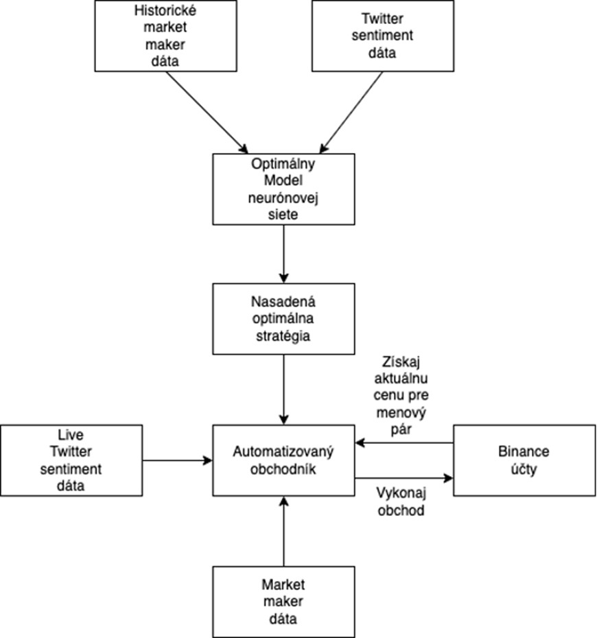 Ako je možné vidieť na priloženom obrázku architektúry, neurónová sieť sa trénuje na historických dátach od market makera a na analýze Twitter sentimentu. Tie následne vytvoria optimálny model, ktorý sa nasadzuje do platformy Automatizovaného obchodníka. Stratégiu je možné meniť kedykoľvek bez nutnosti obchodníka manuálne odstavovať a celý proces prebieha automatizovane. Následne sa bot na optimálnej stratégii rozhoduje, kedy spraviť obchod. Živé dáta do obchodníka sú suplované z troch rôznych zdrojov a to Twitter feed, Binance účty na získanie aktuálnej ceny kryptomeny a live dáta získané od Market makera.
