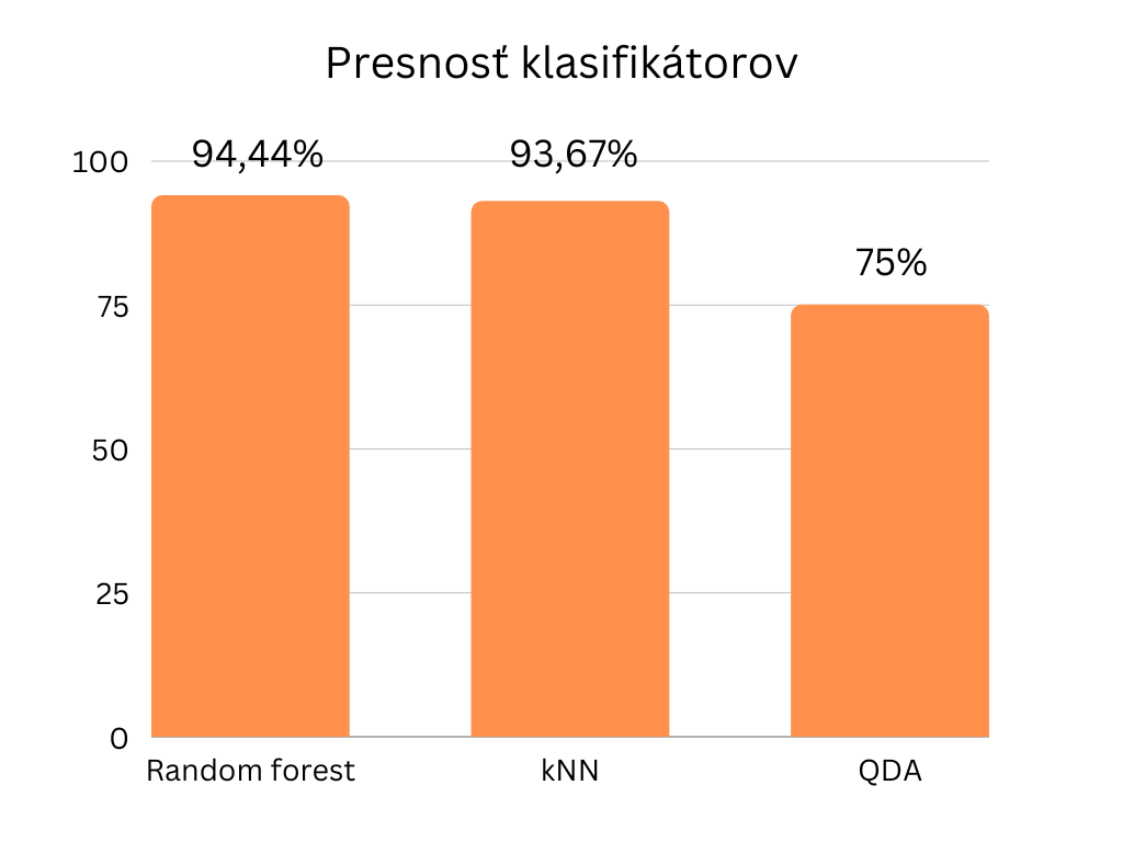 Ďalším dôležitým komponentom nášho riešenia je machine learning – naše klasifikátory dosahujú presnosť 94,44% – Random Forest, 93,67% – kNN a 75% – QDA. Nakoľko na klasifikáciu kávy iónovým spektrometrom neexistujú voľne dostupné datasety, vzali sme veci do vlastných rúk, a vyrobili vlastný dataset. Vzorky kávy sme dôkladne pomleli, vyrobili vzorky a namerali vzorky iónovým spektrometrom. Pomocou týchto meraní sme už vedeli natrénovať klasifikátory.