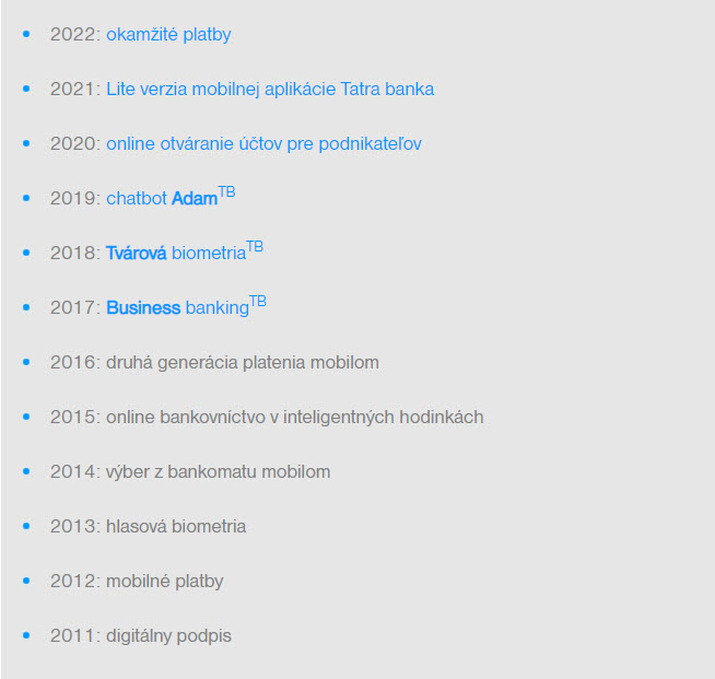 Prísľubom značky Tatra banka je prinášať inovácie, v ktorých centre sú klienti a ich komfort. Za ostatných 10 rokov sme predstavili mnoho noviniek na lokálnej aj regionálnej úrovni. Patria k nim napríklad:
