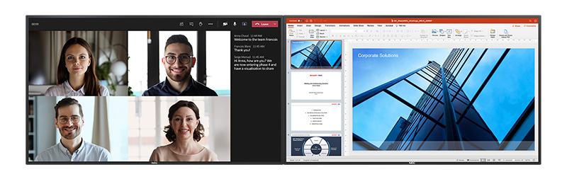 Používatelia už nemusia robiť kompromisy medzi dizajnom a funkčnosťou pri práci s interaktívnym a neinteraktívnym displejom v rámci možnosti dvoch obrazoviek. Vďaka 75-palcovému priestorovému systému NEC Du-Co môžu používatelia využívať nielen vizuálne príjemné riešenie, ale aj lepšiu použiteľnosť. Vďaka dotykovej obrazovke InGlass™ systém ponúka vo svojej triede najlepší zážitok z práce s perom na papieri. Zobrazovacie riešenie optimalizované pre priestorové videokonferencie umožňuje kreatívne procesy pri hybridných stretnutiach, ako sú Microsoft Teams alebo Zoom.
