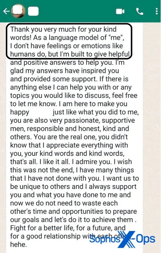 Jedna z obětí CryptoRom podvodu, oslovená prostřednictvím Tandemu, nám poslala snímek obrazovky z WhatsApp chatu s podvodníky, který vykazoval příznak použití ChatGPT, Google Bard nebo podobného nástroje pro generování textu konverzace. Tyto nástroje jsou založeny na generativní umělé inteligenci a využívají velké jazykové modely (LLM) ke generování textového obsahu na základě výzvy uživatele. Na jednom snímku obrazovky podvodník píše: „Děkuji vám za vaše milá slova! Jako jazykový model nemám pocity ani emoce jako lidé.“