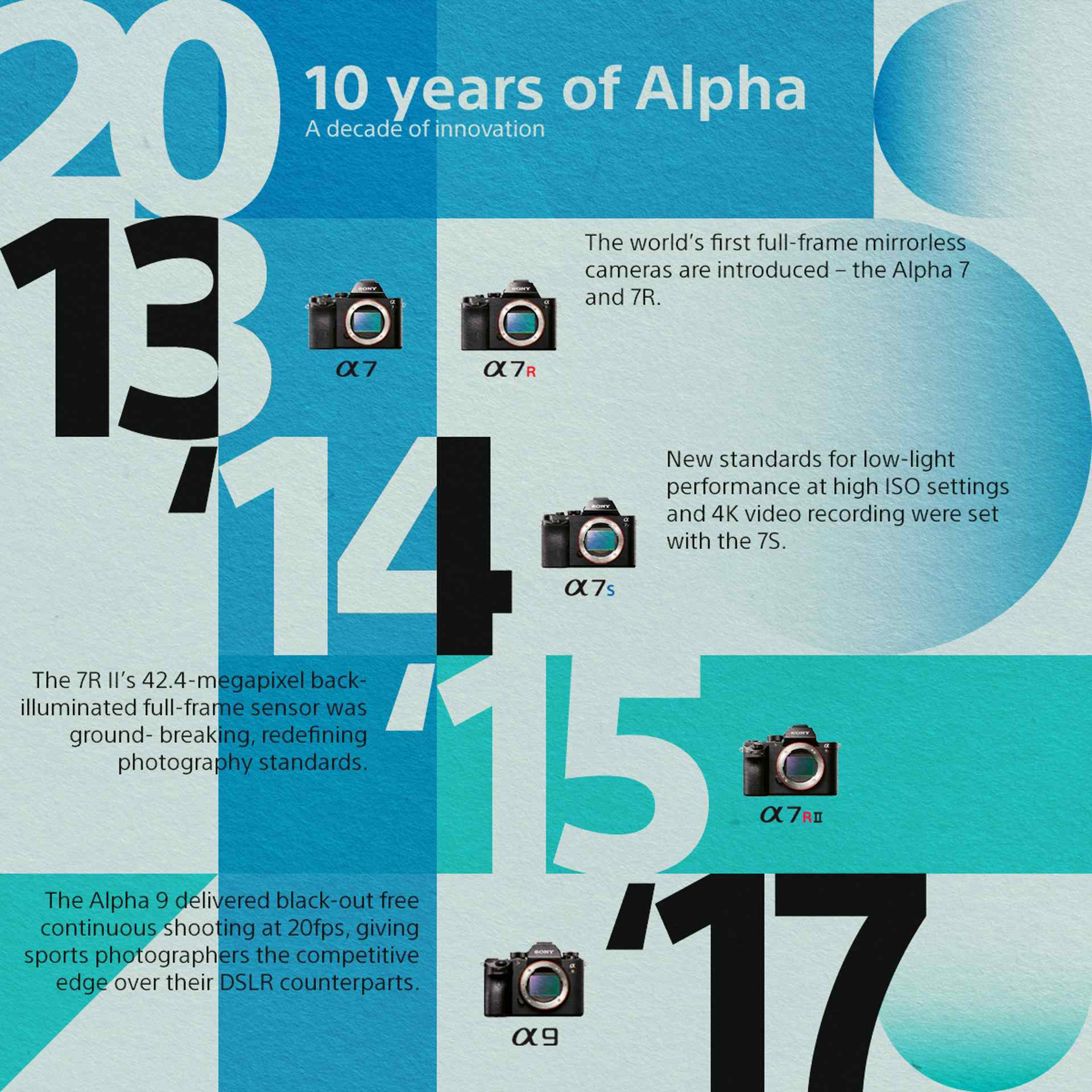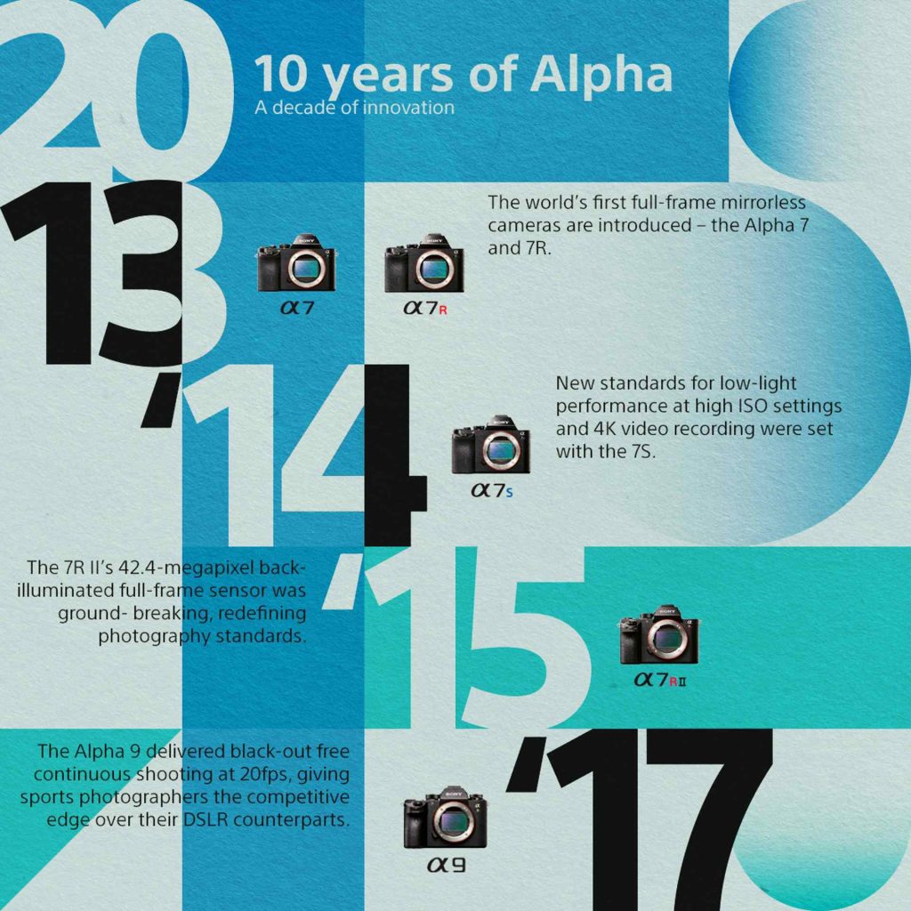 • 2013: Predstavenie prvých bezzrkadlových fullframových fotoaparátov na svete – Sony Alpha 7 a 7R – spôsobilo revolúciu vo fotografovaní. Tieto priekopnícke modely znamenali začiatok stále pokračujúceho vývoja radu Alpha.