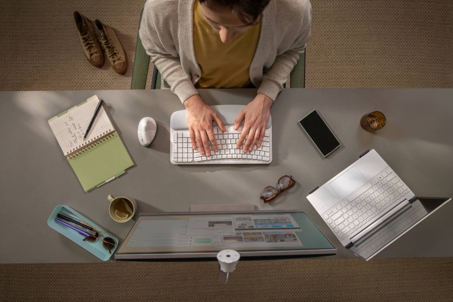 Unikátny zvlnený tvar klávesnice Wave Keys podporuje prirodzenú polohu rúk, zápästia a predlaktia pri písaní, zatiaľ čo integrovaná vypolstrovaná opierka poskytuje stabilnú celodennú oporu dlaní. Zmestí sa prakticky na každý stôl doma alebo v kancelárii a je ponúkaná v troch farebných verziách – grafitovej, krémovej a ružovej (ružová bude k dispozícii na vybraných trhoch v roku 2024), aby čo najlepšie ladila s vašim pracoviskom.