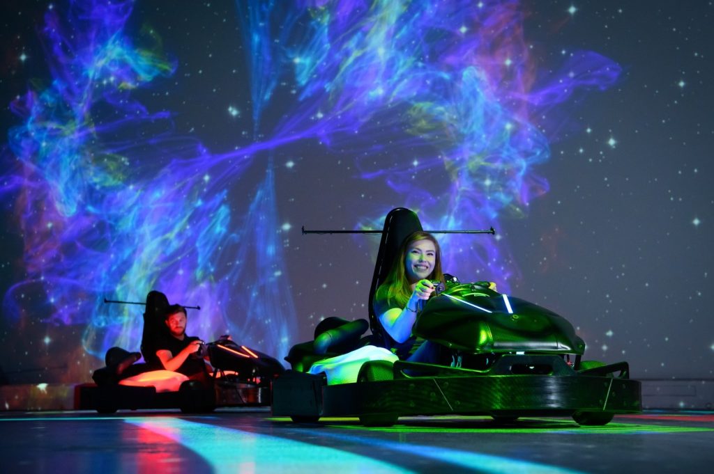Chaos Karts, navržený společností The Ents Inc, je inovativní zážitek, kde hráči projíždí potenciálně nekonečný počet tratí v digitálně promítaném světě, zatímco jejich dopravní prostředek interaguje s virtuální tratí a všemi překážkami, které jim soupeři mohou“postavit“ do cesty. Projektory Panasonic se používají k promítání obrazů obvodů a virtuálních power-upů a zbraní, které může každý hráč používat, a vytvářejí tak skutečně poutavý a pohlcující zážitek z živé akční videohry.