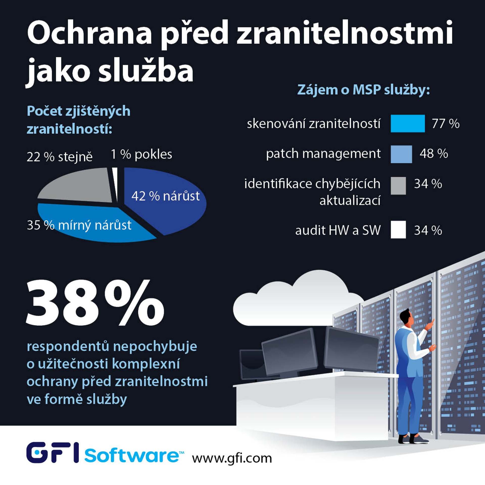 Spoločnosť GFI Software, dodávateľ riešení bezpečnosti v podnikových sieťach, uviedla, že podľa jej prieskumu, ktorý sa uskutočnil medzi českými a slovenskými partnermi a zákazníkmi, 77 % lokálnych IT správcov registruje neustále sa zvyšujúci počet zraniteľností. Mnohí z nich preto uvažujú o skenovaní zraniteľností a inštalácii softvérových záplat, ktoré zabezpečujú poskytovatelia MSP služieb. Dopytovanie sa uskutočnilo v októbri 2023 v rámci sérii konferencií Zebra Cyber Roadshow.
