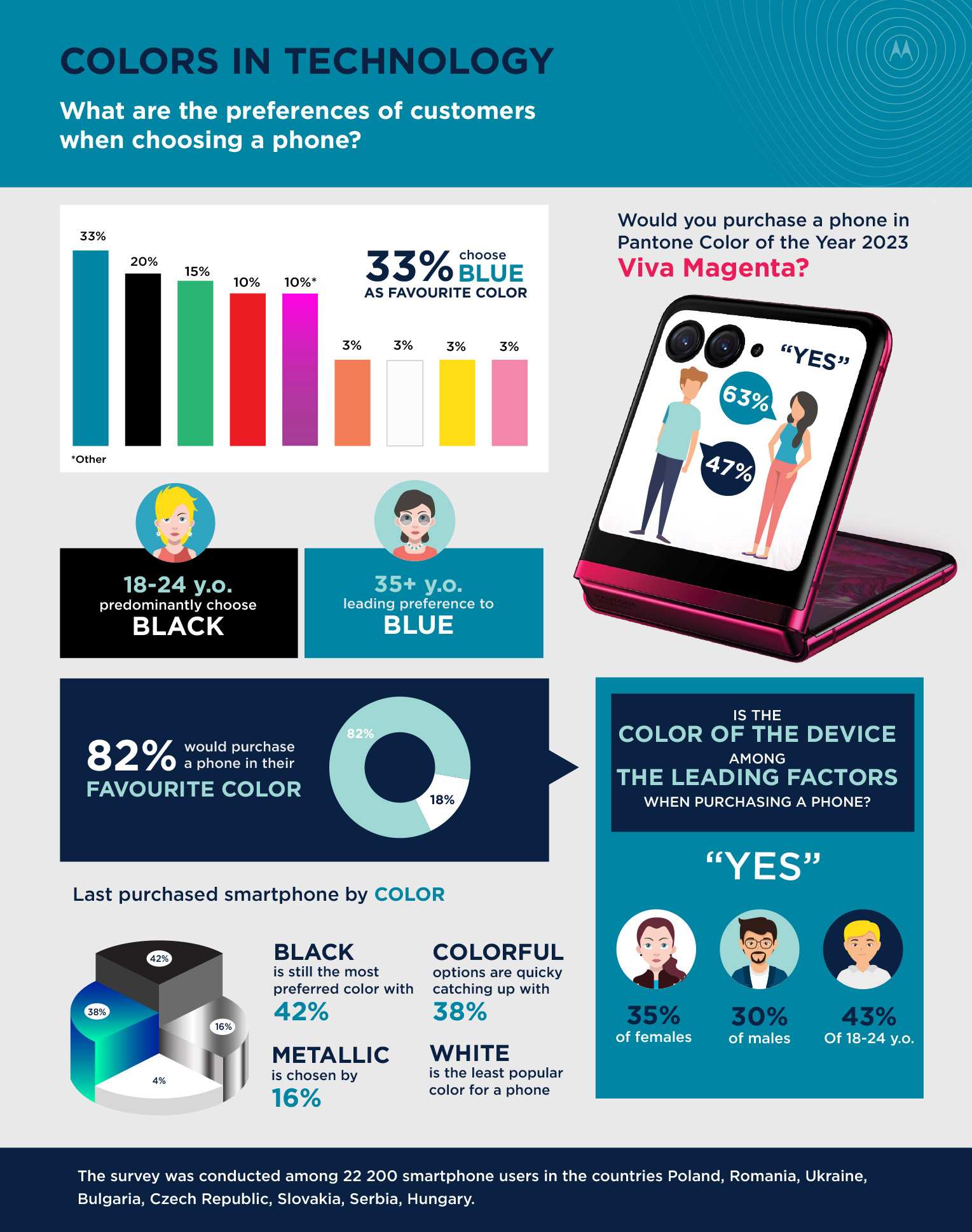 Vyhlásenie farby roka je každoročné predstavenie, ktoré zaujme rôzne odvetvia, od interiérového dizajnu po módu, psychológiu a technológie. Na oslavu oznámenia Farby roka 2024 a exkluzívneho partnerstva s autoritou v oblasti farieb Pantone Color Institute uskutočnila spoločnosť Motorola vôbec prvý prieskum, ktorý ukazuje farebné a materiálové preferencie zákazníkov pri výbere telefónu a skúma postoje a želania spotrebiteľov v strednej a východnej Európe. Prieskum ukázal niekoľko prekvapivých výsledkov, napríklad bielu farbu ako najmenej žiadanú pri kúpe smartfónu a silnú 47 % túžbu vlastniť telefón v odtieni Viva Magenta u mužských respondentov. Pozrime sa na niektoré ďalšie najpresvedčivejšie a najpozoruhodnejšie výsledky prieskumu, ktorý sa uskutočnil v 8 krajinách – na Slovensku, v Českej republike, Poľsku, Rumunsku, Bulharsku, Ukrajine, v Maďarsku a Srbsku na vzorke 22 200 respondentov.