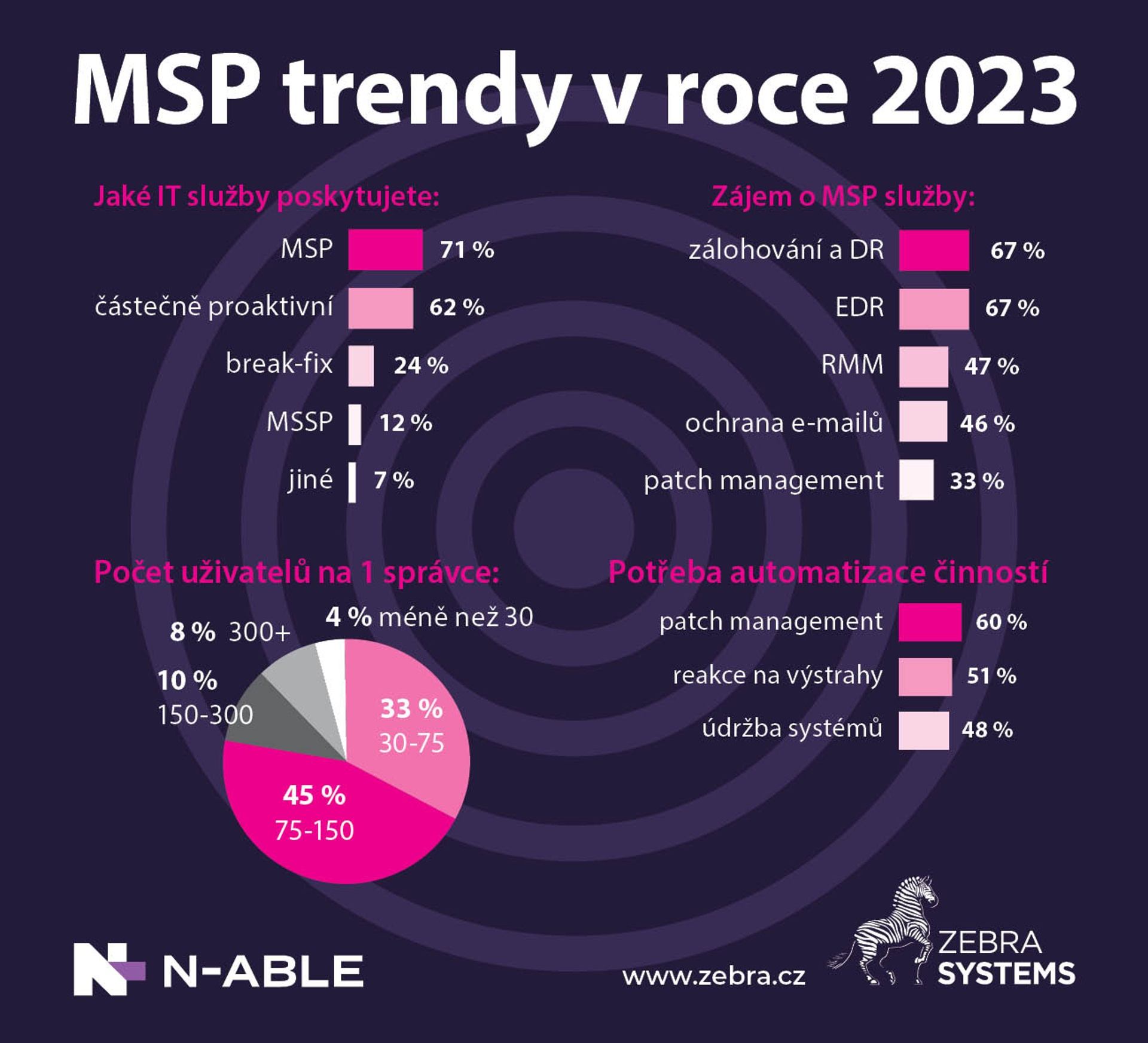 Spoločnosť ZEBRA SYSTEMS, distribútor riešení N-able na českom a slovenskom trhu, na základe svojho celoročného dopytovania identifikovala hlavné MSP trendy roku 2023 medzi českými a slovenskými IT poskytovateľmi. Na špičke rebríčka je rastúci záujem zákazníkov o MSP služby IT bezpečnosti (hlavne EDR/XDR), zvyšujúci sa tlak na produktivitu IT administrátorov a s tým súvisiaca automatizácia rutinných úloh.
