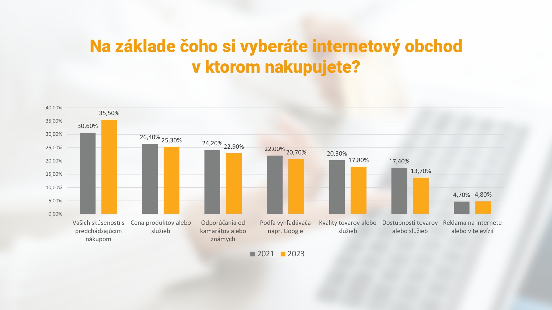 Nakupovanie na internete nie je už len o cene a kvalite daného tovaru. Pre majiteľov e-shopov môže byť dôležité zistenie, že pre nakupujúcich je dôležitá najmä vlastná skúsenosť s daným internetovým obchodom. Kým si na základe tohto faktoru v roku 2021 vyberalo e-shop 30,6% nakupujúcich, tento dôvod uviedlo ako najdôležitejší aj v roku 2023 až 35,5% respondentov. Cena produktu je na druhom mieste. Za rozhodujúcu ju považovali 26,4% resp. 25,3% respondentov.