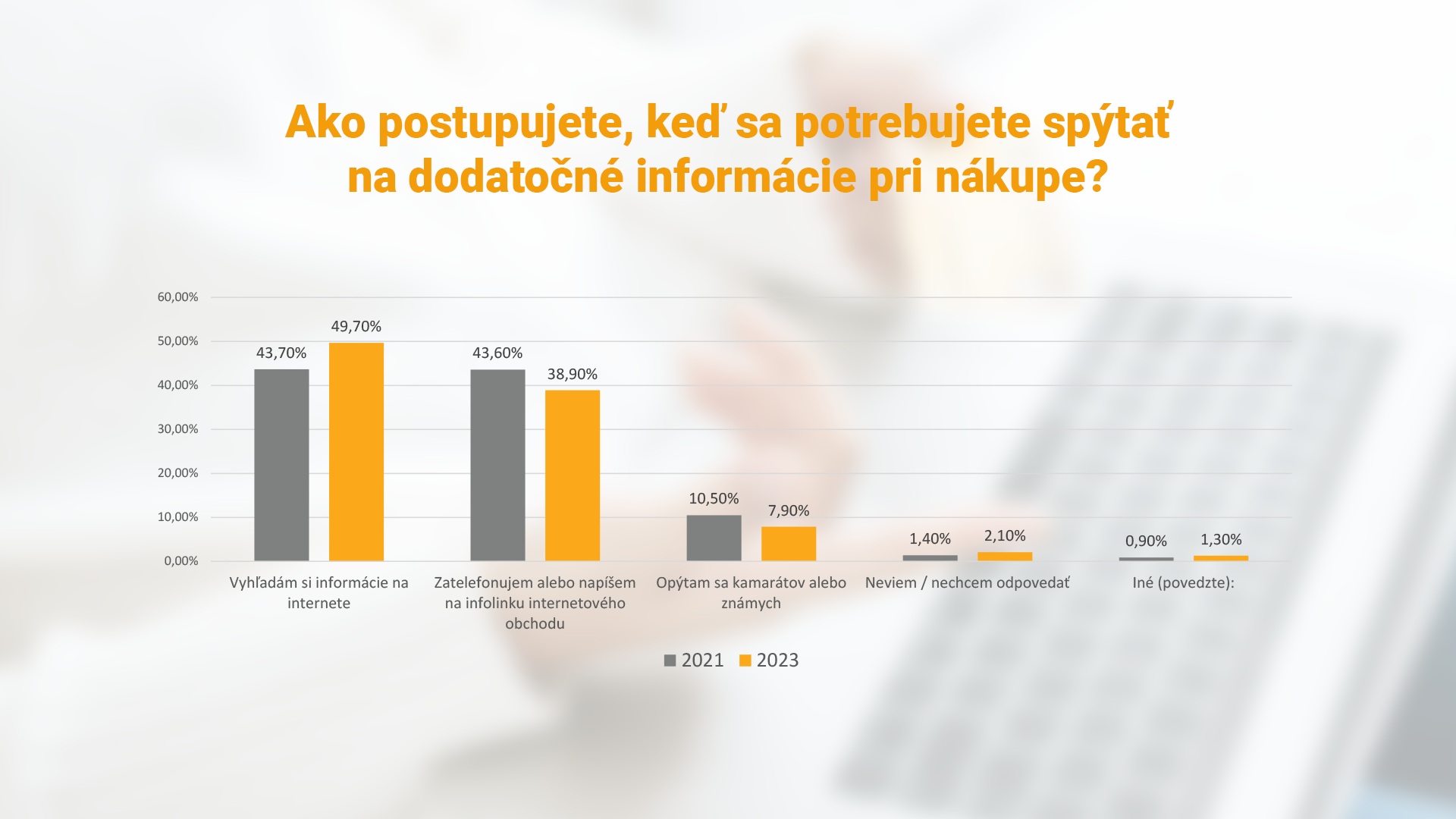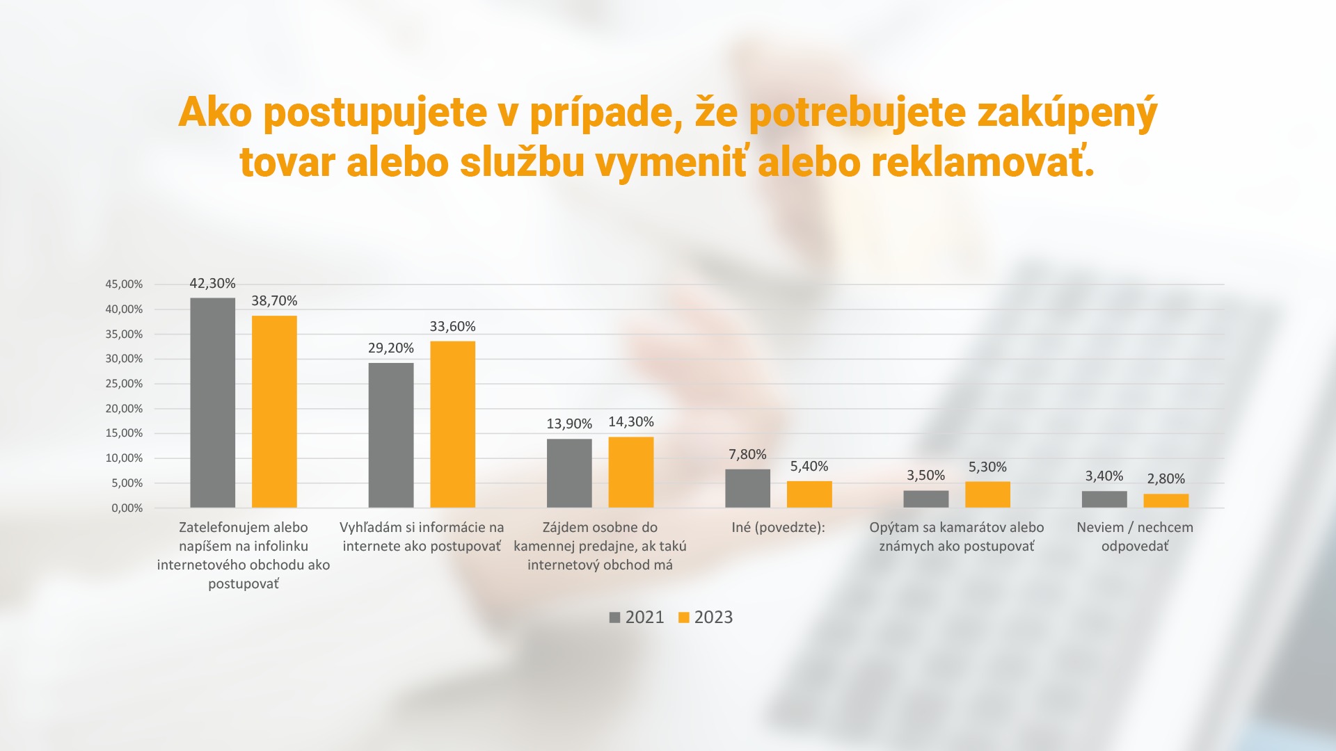 Pri hľadaní dodatočných informácií sa zákazníci teda spoliehajú najmä na seba a informácie si hľadajú sami. Spotrebiteľské správanie sa ale mení v prípade, že zákazníci potrebujú akútne informácie napríklad o reklamáciách. V takom prípade si ich na webovej stránke e-shopu v roku 2021 vyhľadalo 42,3% a v roku 2023 to bolo 38,7%. Na druhú stranu vzrástol počet ľudí, ktorí v prípade reklamácie kontaktujú priamo infolinku z 29,2% na 33,6%. V oboch sledovaných prieskumoch zájde takmer 14% respondentov do kamennej predajne internetového obchodu, ak je taká možnosť.