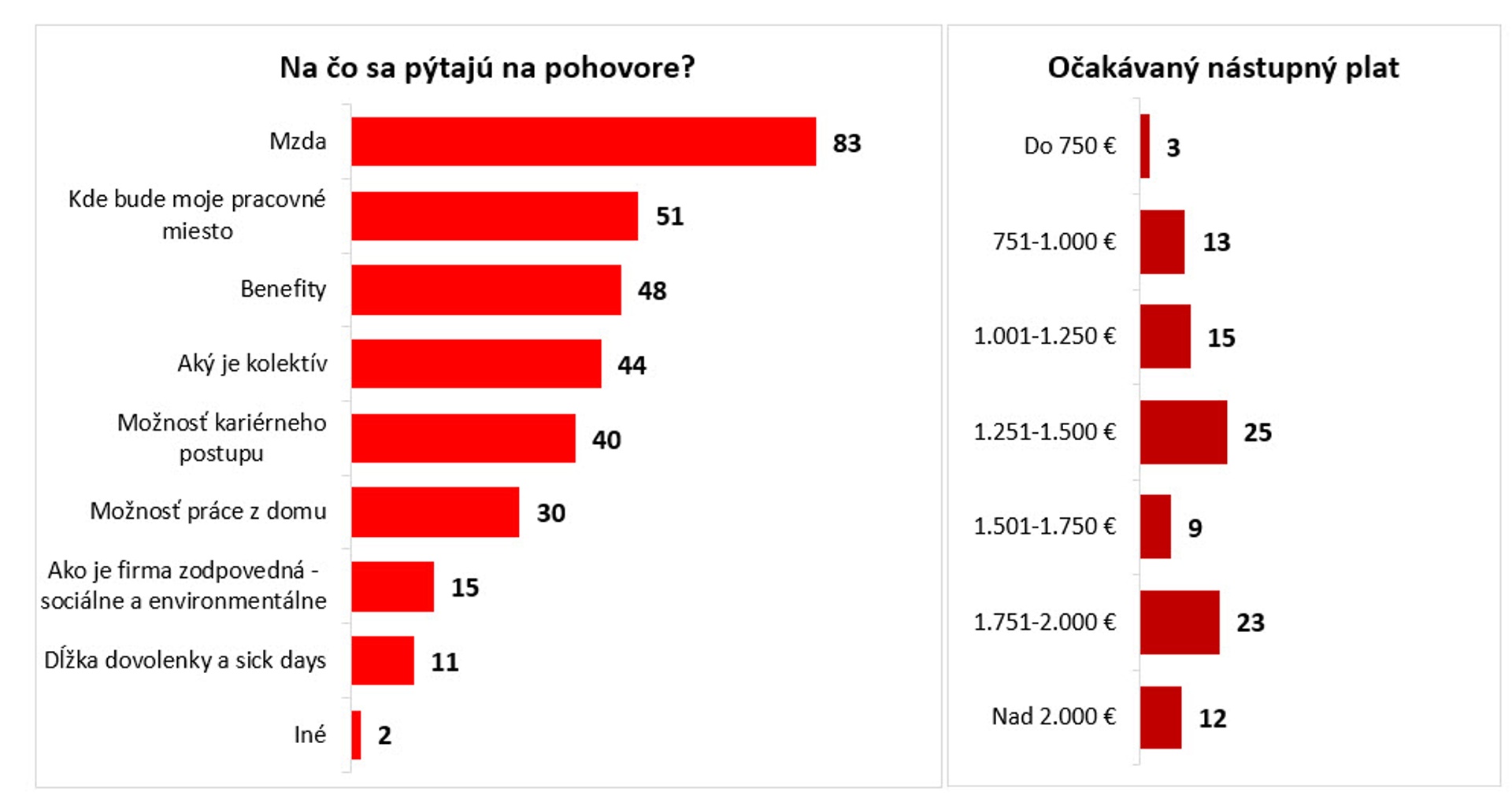 Očakávaný nástupný plat väčšiny Slovákov (spolu 56 percent) je do sumy 1500 eur. Keď sa na to pozrieme detailnejšie, tak najčastejšie je to v rozmedzí 1250 až 1500 eur. Len o niečo menej (23 percent) je takých, ktorí by chceli o pár stovák navyše – 1500 až 1750 eur. Dvanásť percent respondentov by zase nebolo ochotných zarábať menej ako 2000 eur. Na druhej strane, sú tu len tri percentá ľudí, ktorým by stačilo aj 750 eur, čo je momentálne na Slovensku hranica minimálnej mzdy.