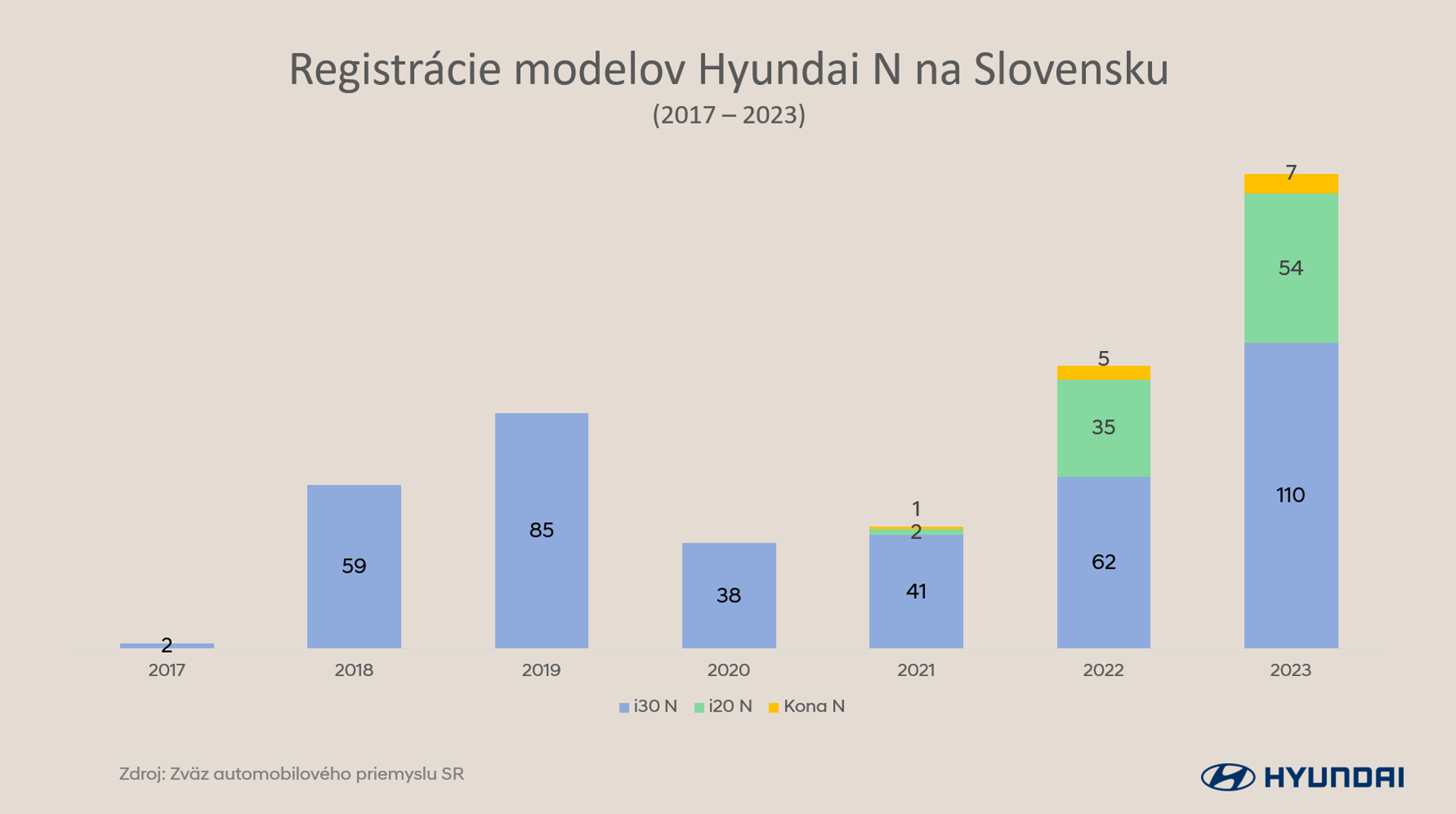 Rok 2023 bol pre vysokovýkonné modely Hyundai N najúspešnejší v doterajšej histórii. Celkovo si slovenskí zákazníci prevzali až 171 kusov nových vozidiel i20 N, i30 N a Kona N. Najviac registrácií si na konto tradične pripísal i30 N (110 ks), nasledovali i20 N (54 ks) a Kona N (7 ks).