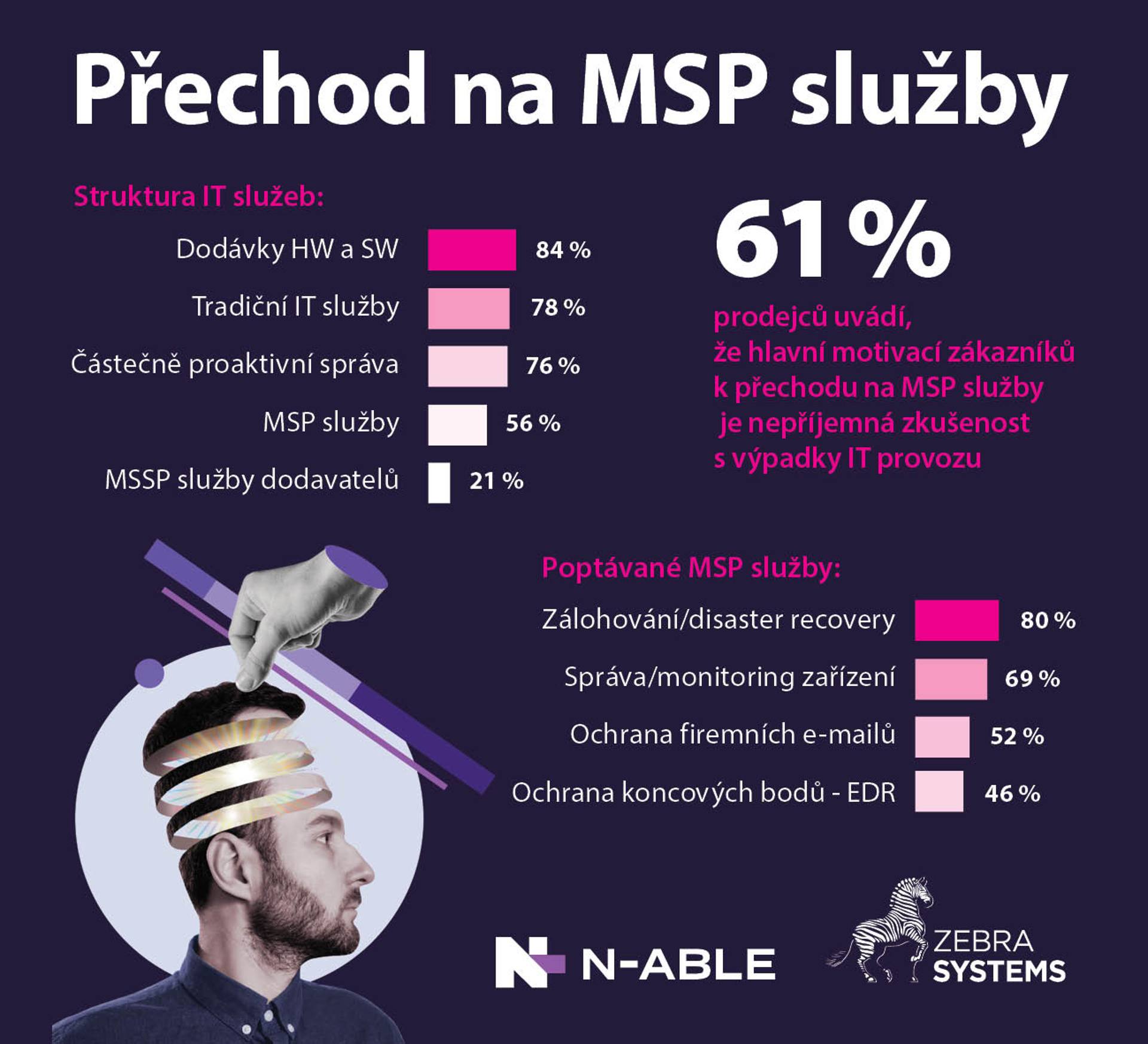 Spoločnosť ZEBRA SYSTEMS, distribútor riešení N-able na českom a slovenskom trhu, uviedla, že v rámci svojho prieskumu viac ako 60 % jej predajcov odpovedalo, že hlavnou motiváciou zákazníkov na prechod na MSP služby je nepríjemná skúsenosť s výpadkami IT prevádzky. Stále viac IT dodávateľov tak ponúka svojim zákazníkom popri tradičných aj MSP služby, pričom najväčší dopyt je v súčasnosti po službách zálohovania a obnovy po havárii či správe a monitoringu IT zariadení.