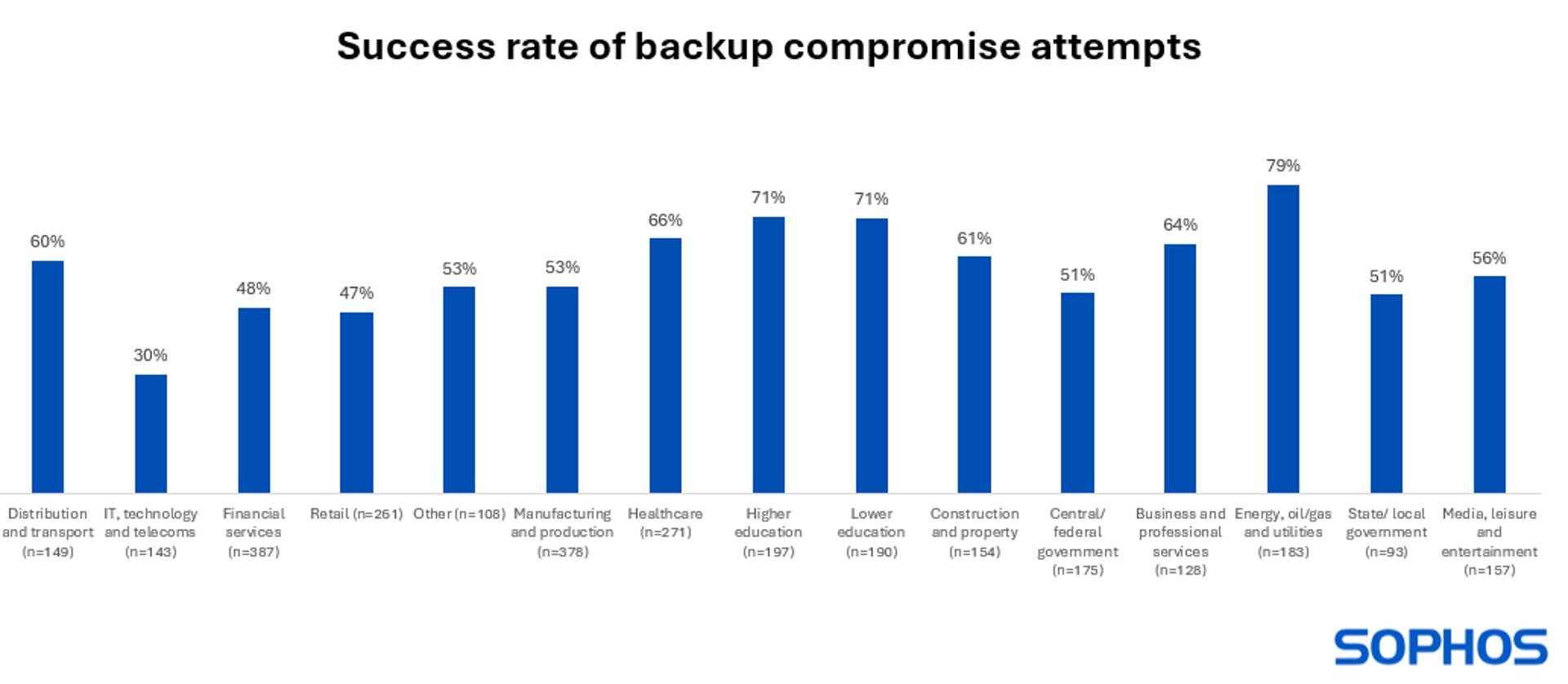 V rámci všech odvětví bylo 57 % pokusů o kompromitaci záloh úspěšných, což znamená, že protivníci byli schopni ovlivnit proces obnovy po ransomwarovém útoku u více než poloviny svých obětí. Zajímavé je, že analýza odhalila značné rozdíly v úspěšnosti útočníků podle odvětví: Útočníci nejčastěji úspěšně kompromitovali zálohy svých obětí v odvětvích energetiky, těžby a zpracování ropy či plynu a veřejných služeb (79% úspěšnost) a také v oboru vzdělávání (71% úspěšnost). Naopak nejnižší míru úspěšné kompromitace záloh vykázaly podniky z oblasti IT, technologií a telekomunikací (30 % úspěšnost) a maloobchodní společnosti (47 % úspěšnost).