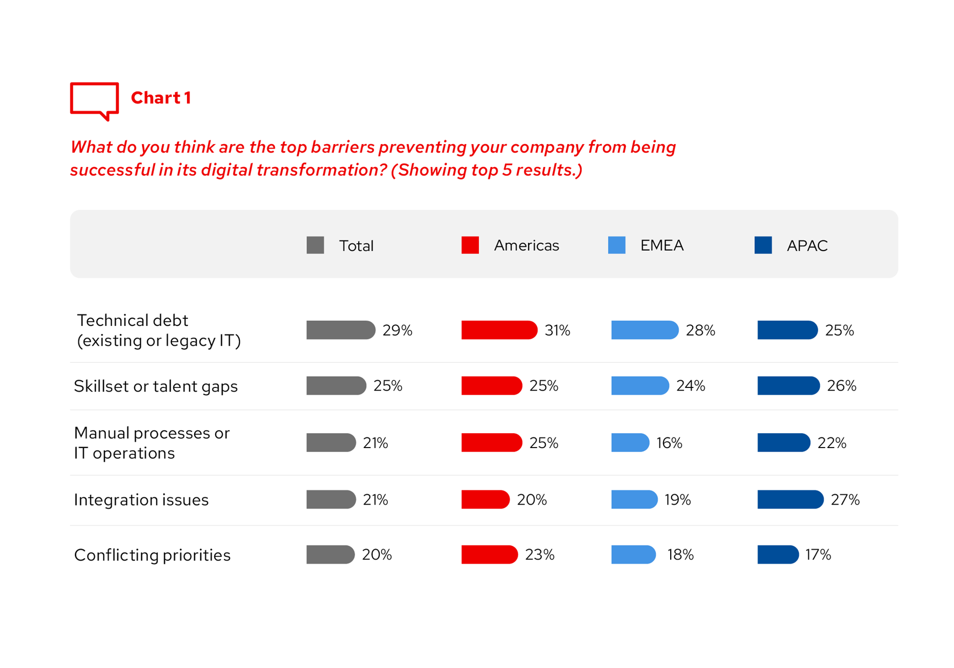 Překážky úspěchu digitální transformace zůstaly v posledních několika letech poměrně konzistentní. Jako hlavní oblasti, které brání organizacím v úspěchu, byly označeny manuální procesy nebo provoz IT, technický dluh a nedostatek dovedností nebo talentů. Manuální procesy byly ale častěji uváděny jako překážka v Severní a Jižní Americe a méně často v regionu EMEA. Vzhledem k tomu, že je automatizace tak významným tématem v mnoha oblastech IT, není překvapením, že společnosti začínají automatizovat v mnoha oblastech. Automatizace zabezpečení, cloudových služeb a poskytování služeb jsou proto při financování první na řadě. Až na konci seznamu překážek zůstává nedostatek finančních prostředků a nutnost snižovat náklady, a to navzdory ekonomické nejistotě a napjatějším rozpočtům.