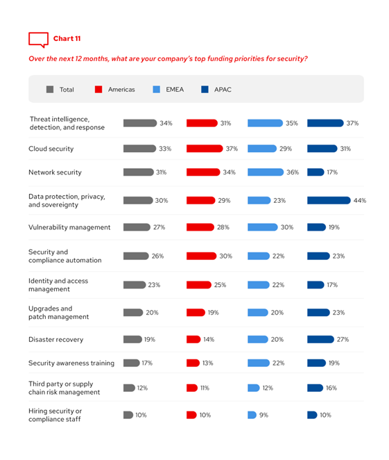 Financování zjišťování, detekce a reakce na hrozby a zabezpečení cloudu upřednostňuje celkově třetina respondentů. Ale například subjekty v Asijsko-pacifickém regionu (APAC) upřednostňují před zabezpečením sítě ochranu dat, jejich soukromí a suverenitu, stejně jako obnovu po havárii. Nabízí se tedy otázka, zda nejsou některé aspekty bezpečnosti financovány nedostatečně.
