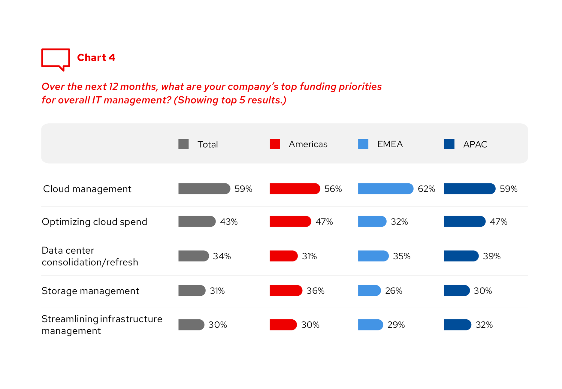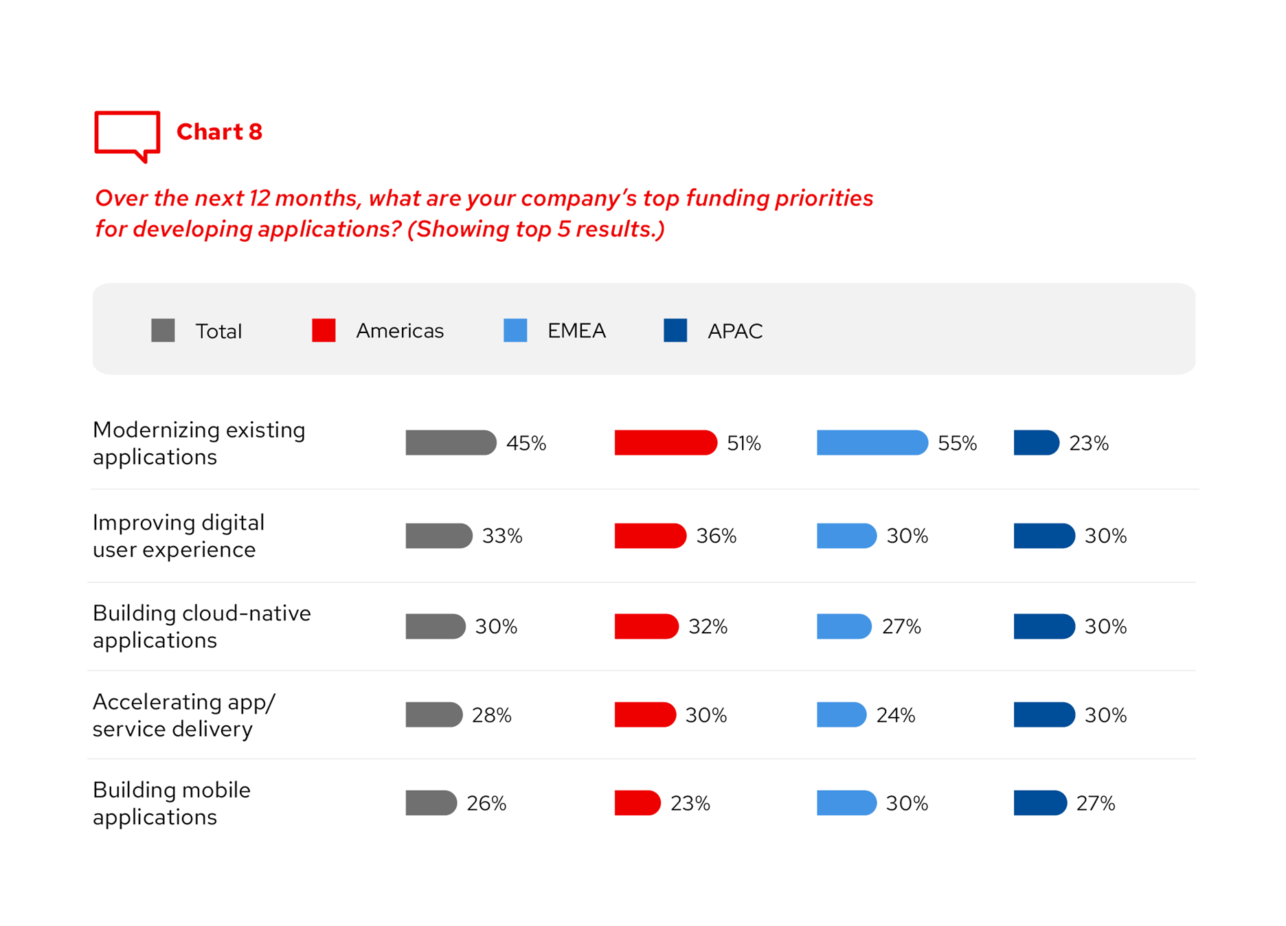 Modernizace stávajících aplikací je nejvyšší prioritou v oblasti financování vývoje aplikací (45 %). Dalšími prioritami jsou zlepšení digitální uživatelské zkušenosti, vytváření nativně cloudových aplikací a zrychlení poskytování aplikací a služeb. Priority financování vývoje aplikací se ale v jednotlivých regionech liší. Zatímco v regionu EMEA a Severní i Jižní Americe v je pořadí priorit financování vývoje aplikací poměrně podobné, v regionu APAC je různorodější a modernizace aplikací je na seznamu poměrně nízko.