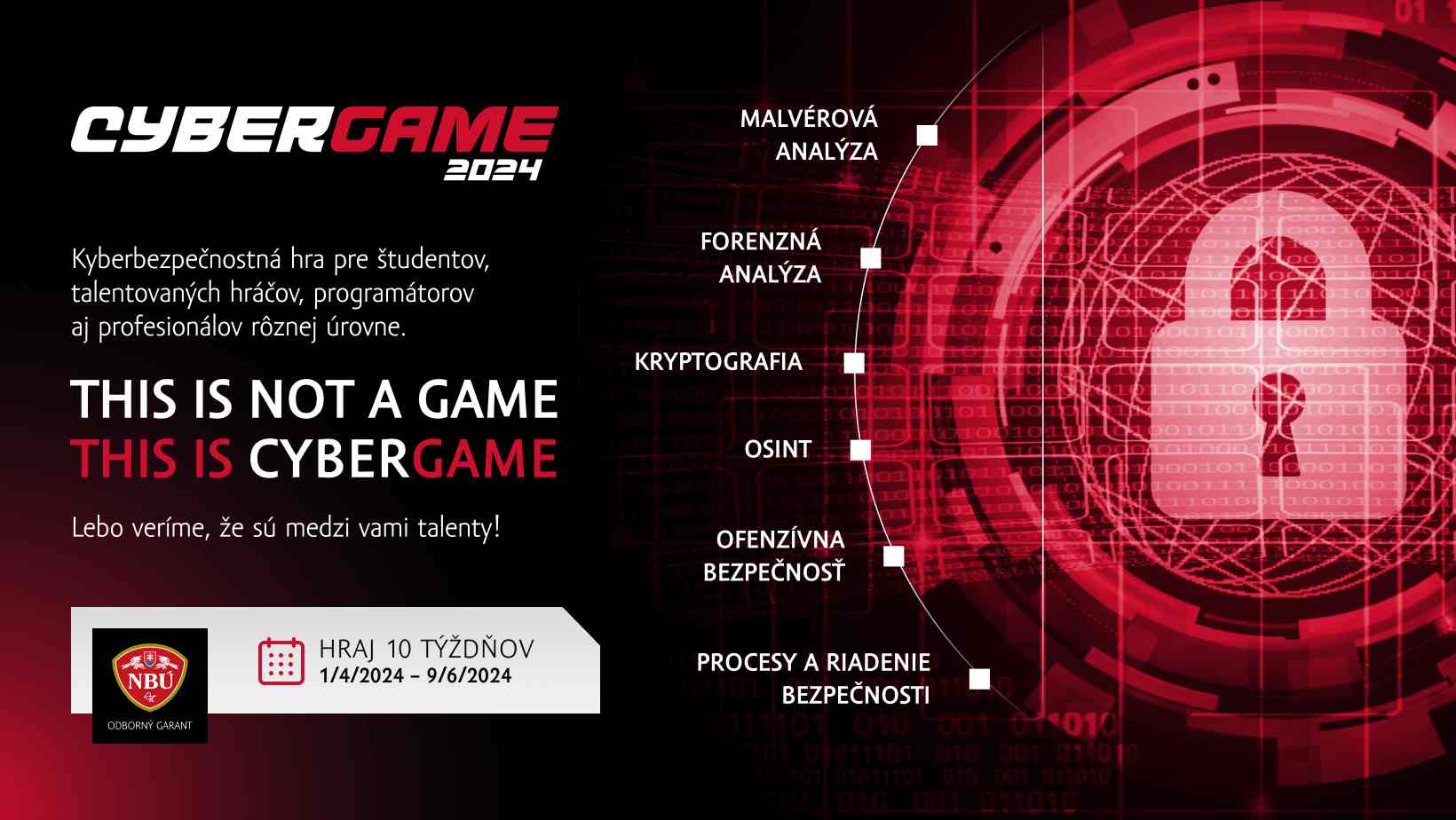 CyberGame 2024 sa hrá desať týždňov od 1.4. do 9.6. 2024. Registrácia www.cybergame.sk