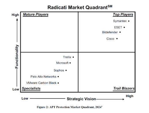Správa spoločnosti Radicati popisuje ako jednotliví dodávatelia bezpečnostných riešení obstoja v konkrétnych technologických trhoch v danom čase. V správe sa o spoločnosti ESET píše, že patrí medzi „súčasných lídrov trhu s produktmi, ktoré ponúkajú širokú a hlbokú funkcionalitu, ako aj solídnu víziu do budúcnosti.“ Najlepší hráči podľa Radicati formujú trh svojimi technológiami a strategickou víziou.