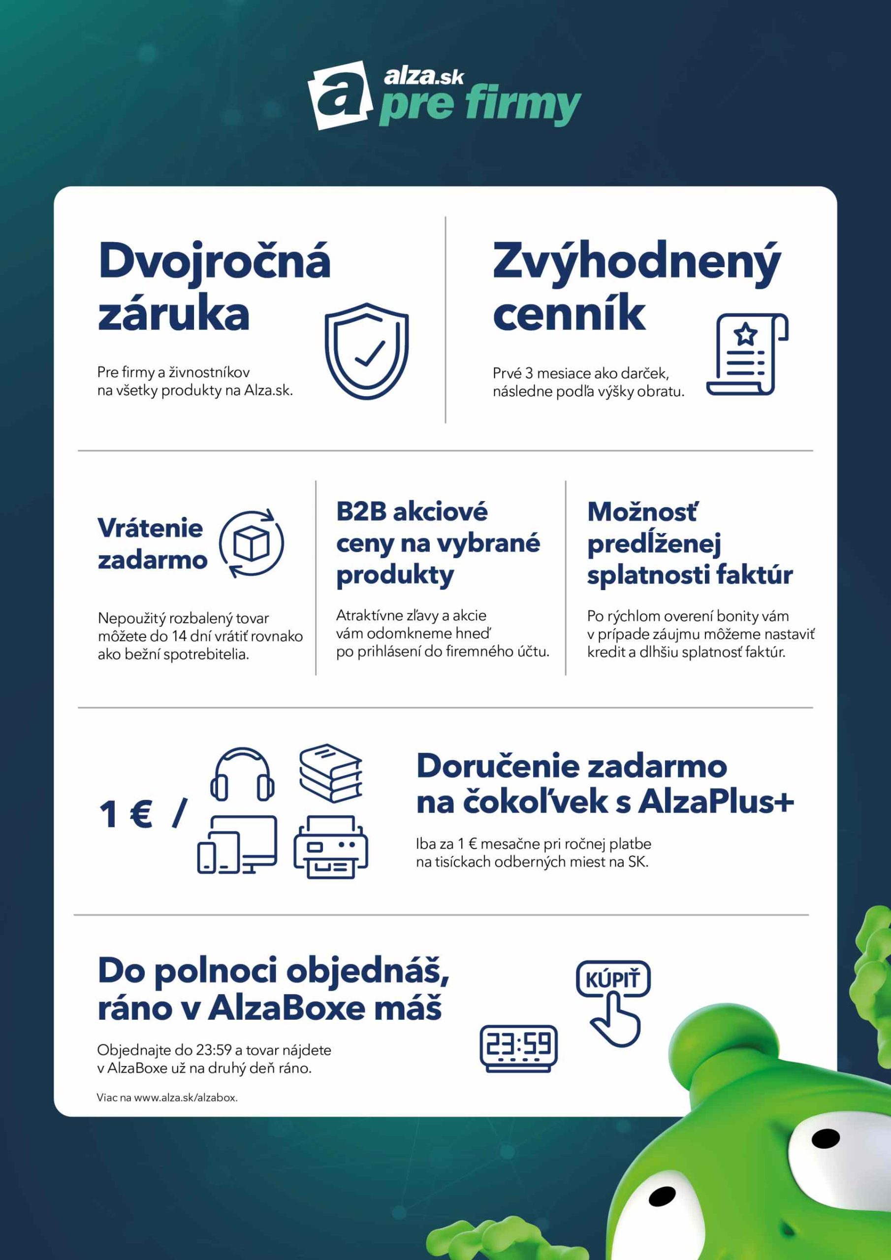 Program Alza pre firmy už niekoľko rokov ponúka unikátnu službu pre firmy všetkých veľkostí – od drobných živnostníkov, cez nadnárodné korporácie až po štátne inštitúcie. Kombinuje širokú ponuku produktov, zvýhodnený cenník vrátane akciových B2B ponúk a ďalšie výhody. Tými sú napríklad predĺžená splatnosť, prenájom elektroniky, benefity pre vlastných zamestnancov alebo možnosť využívať v rámci firemnej registrácie aj členský program AlzaPlus+ s doručením zadarmo do všetkých výdajných miest e-shopu na objednávky v akejkoľvek výške. „Nastavujeme tým nový štandard na B2B trhu. Donedávna sme boli jediní, kto dvojročnú záruku poskytoval. Do nasledujúceho obdobia túto výhodu budeme mať stále ako jednu z hlavných komunikačných liniek. Na základe našich interných prieskumov totiž menej ako polovica firemných zákazníkov stále netuší, že Alza.sk dvojročnú záruku podnikateľom a spoločnostiam ponúka, ako keby to boli koncoví zákazníci,“ upozorňuje Lukáš Glöckl.