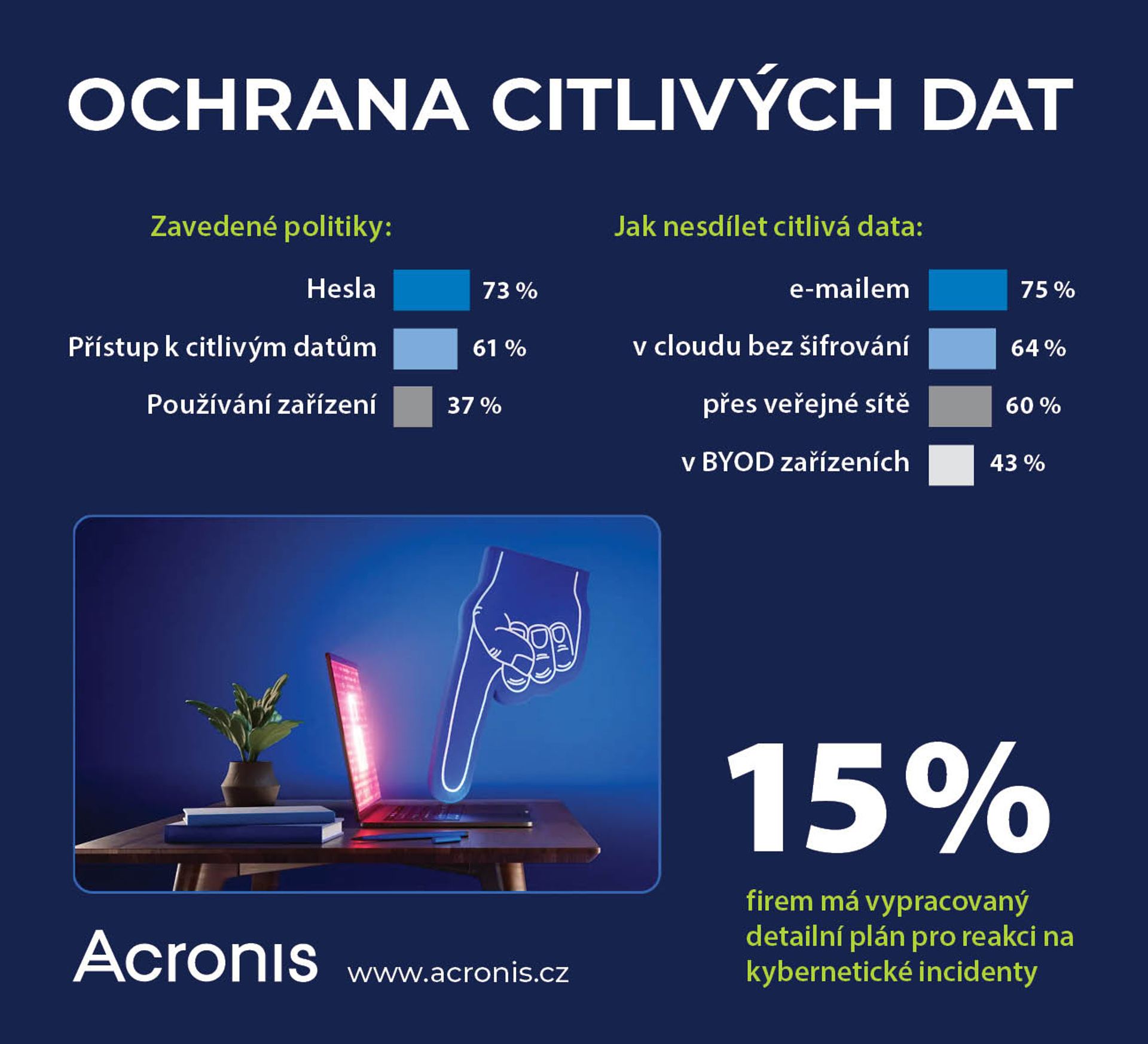 Acronis, globálny líder na trhu riešení kybernetickej ochrany, predstavil výsledky prieskumu, ktorý sa uskutočnil medzi ich českými a slovenskými IT partnermi v oblasti ochrany firemných dát. Podľa odpovedí respondentov už 61 % podnikov má zavedenú politiku ochrany citlivých dát. Na druhej strane iba veľmi málo z nich má detailný plán pre prípad kybernetických incidentov a sotva tretina sa kryje poistením kybernetických rizík.