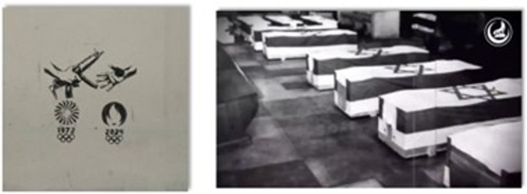 Obrázok 3: Obrázok graffiti údajne z Paríža, ktoré hrozí zopakovaním teroristických útokov z Mníchova 1972 počas nadchádzajúcich olympijských hier (vľavo). Obrázok so záberom z teroristickej hrozby pod falošnou vlajkou, údajne od tureckej ultranacionalistickej skupiny Siví vlci, ktorej symbol je viditeľný v pravom hornom rohu obrazovky. Video bolo masívne šírené proruskými botovými účtami a vyvolalo reakciu Izraelského olympijského výboru (vpravo).