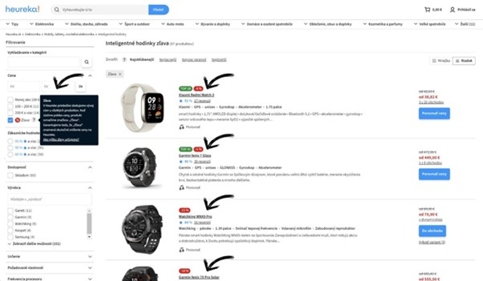 - Platné zľavy: Na Heureke sa zobrazujú iba zľavy, ktoré sú väčšie alebo rovné ako 5 % a nižšie alebo rovné ako 80 %.