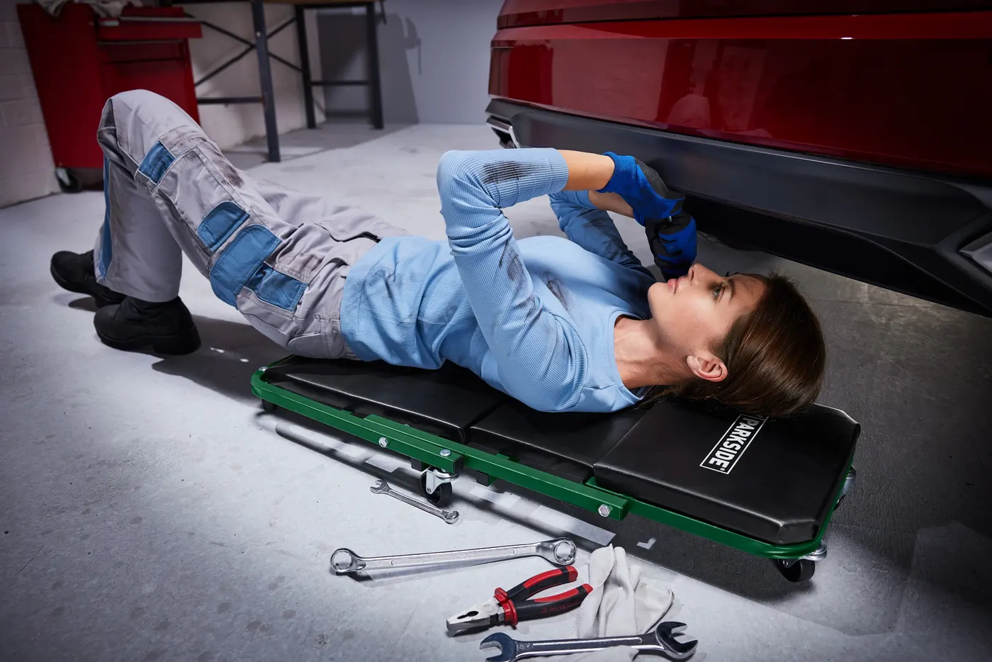 Montážna rolovacia doska PARKSIDE je ideálna pre práce, ktoré je potrebné vykonávať v ľahu pod vozidlom. S plochou na ležanie 91 centimetrov ponúka dostatok pohodlia pri práci vo vodorovnej polohe. Zároveň je možné lavicu použiť aj ako sedadlo. Konštrukciu je možné premeniť na dielenskú stoličku v niekoľkých jednoduchých krokoch, ktorá má nosnosť až 120 kilogramov.