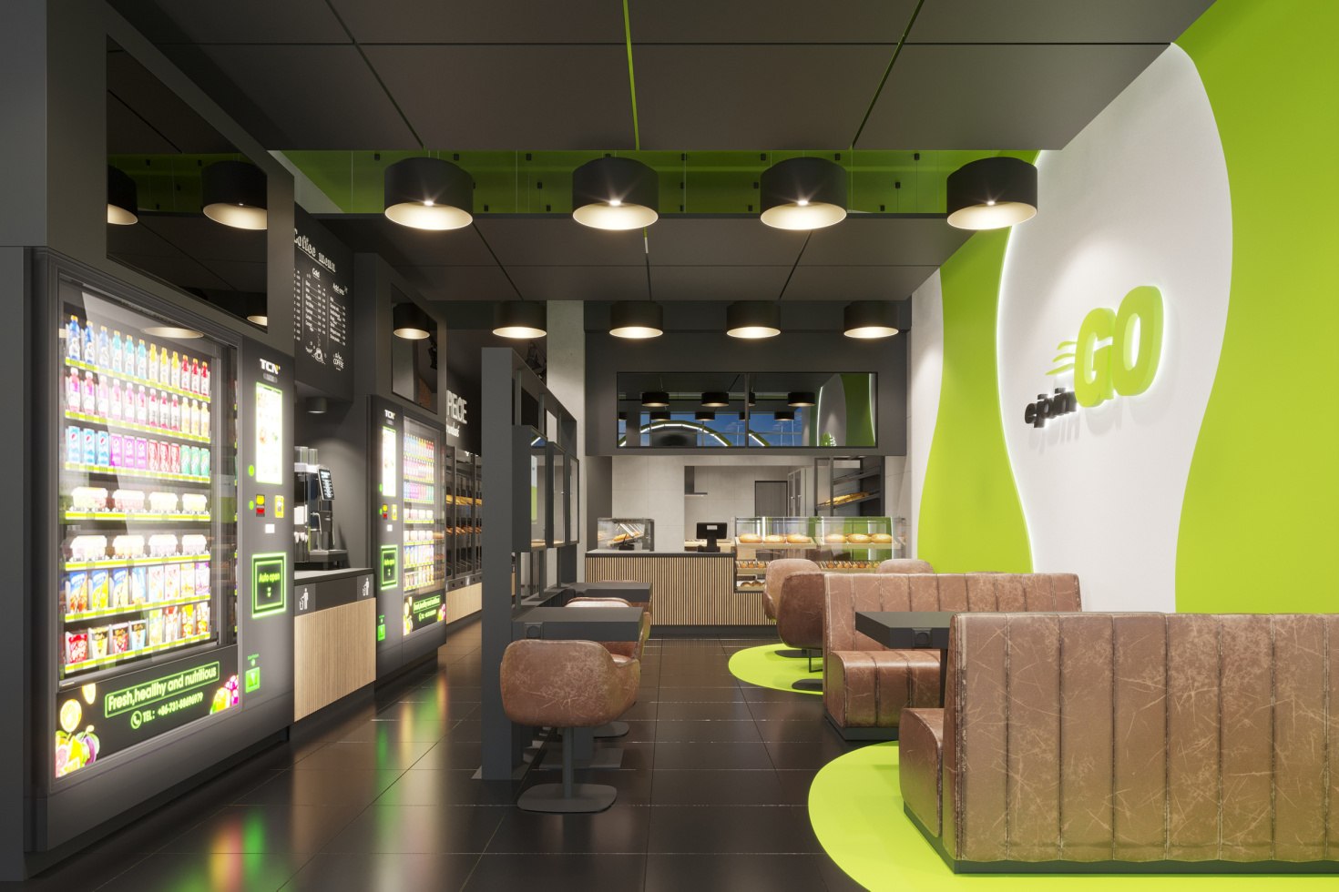 Priamo v zázemí bude k dispozícii aj časť s inteligentnými chladničkami na priamy nákup rôznych zdravých snackov, hotových jedál a nápojov, ako aj samoobslužný kávovar na prípravu čerstvej kávy so sebou. Priestorovo, ale aj ponukou, bude výraznou súčasťou miesto s čerstvým pečivom a pekárenskými výrobkami. Samozrejmosťou je hygienické zázemie s toaletou, ktoré kompletizuje dostupné služby pre maximálne pohodlie.