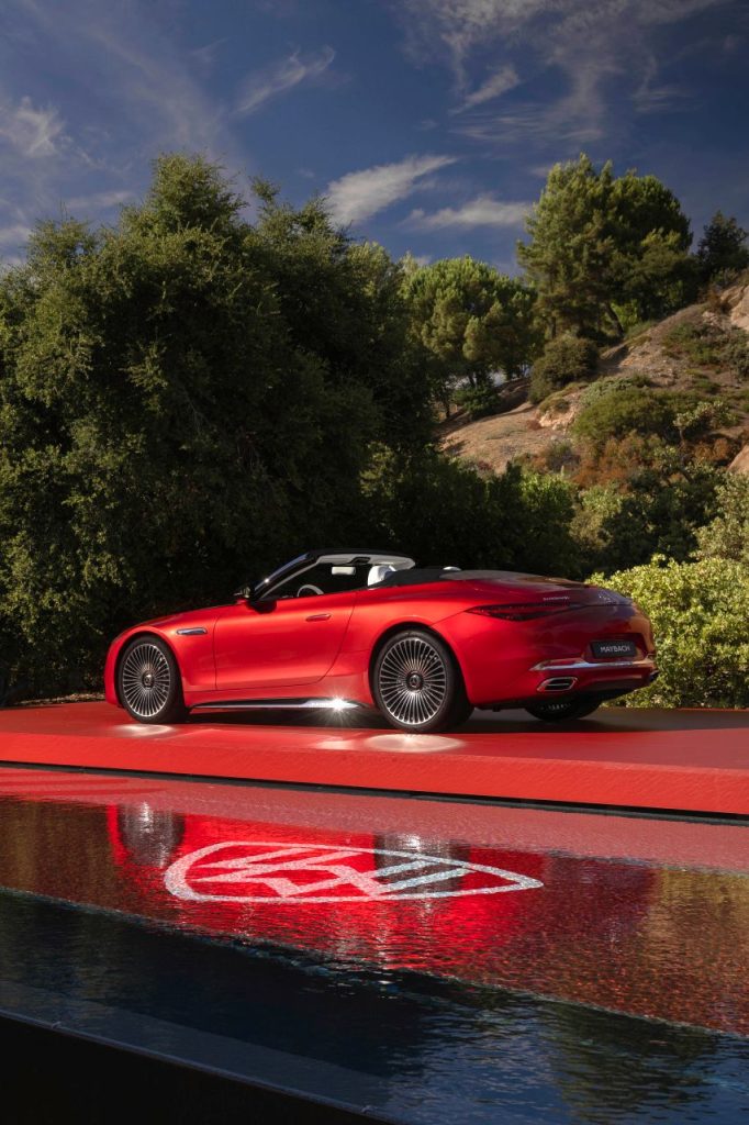 Dômyselne izolovaná protihluková komfortná sklápacia strecha pozostáva z látky vo farebnom odtieni svetlá čierna s decentne integrovaným vzorom Maybach v antracitovej farbe. Zadnú časť vozidla charakterizujú zadné svietidlá so znakom Maybach, osobitý spojler zadného nárazníka s chrómovou ozdobnou lištou, špecifický dizajn difúzora a pre značku typické koncovky výfuku s horizontálnym mostíkom. Individuálny vzhľad oblasti za sedadlami zvýrazňuje aerodynamicky navrhnutá dvojitá vydutina. Spolu s pochrómovanou plutvou na kapote motora dodáva dvojmiestnemu vozidlu veľmi elegantné športové tvary, najmä keď je sklápacia strecha otvorená.