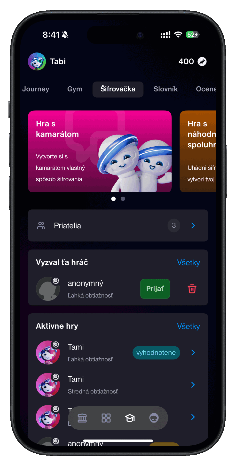 Práve hernú oblasť rozširujeme o zaujímavú hru aj nové funkcionality. Najnovšia hra prináša nečakaný zážitok, keďže sa zakladá na kooperácii. Deti ešte viac vťahuje do učenia sa o svete financií, a to prostredníctvom hry so spoluhráčom. Dieťa môže nadviazať cez aplikáciu priateľstvá so svojimi rovesníkmi, ako to poznajú z iných herných prostredí, a môžu sa navzájom vyzývať do šifrovacích hier v troch leveloch náročnosti.