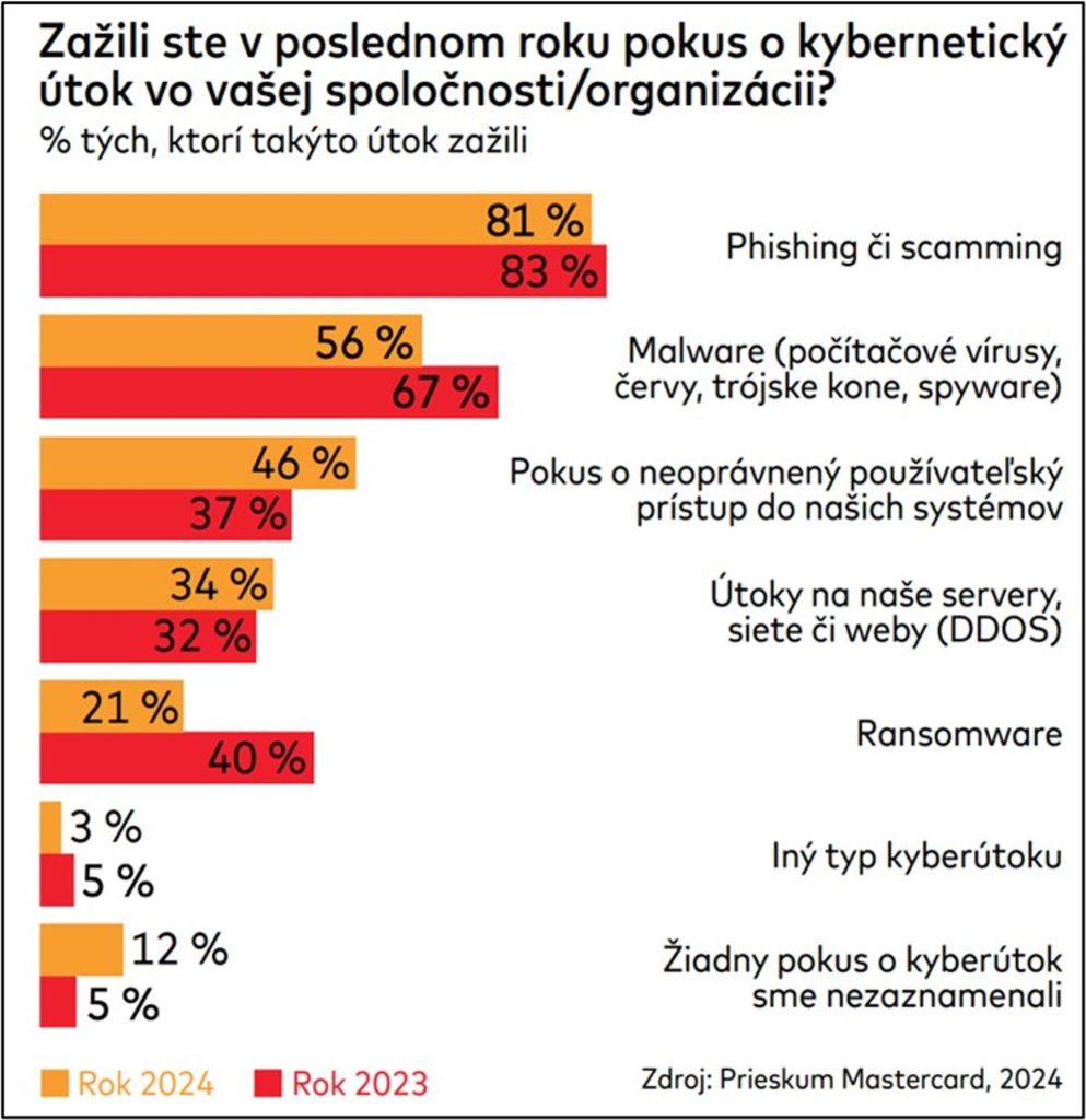 Najčastejším typom kyberútoku bol v minulom roku phishing. Stretlo sa s ním 8 z 10 podnikov a organizácií. To je zrejme aj dôvod, prečo sú v oblasti kybernetickej bezpečnosti hlavnými témami ľudské zlyhanie a edukácia zamestnancov. Naopak, s ransomwarom sa stretlo menej firiem a organizácií ako vlani, tu sme zaznamenali pokles zhruba na polovicu. O niečo nižšia bola aj evidencia útokov prostredníctvom malwaru.