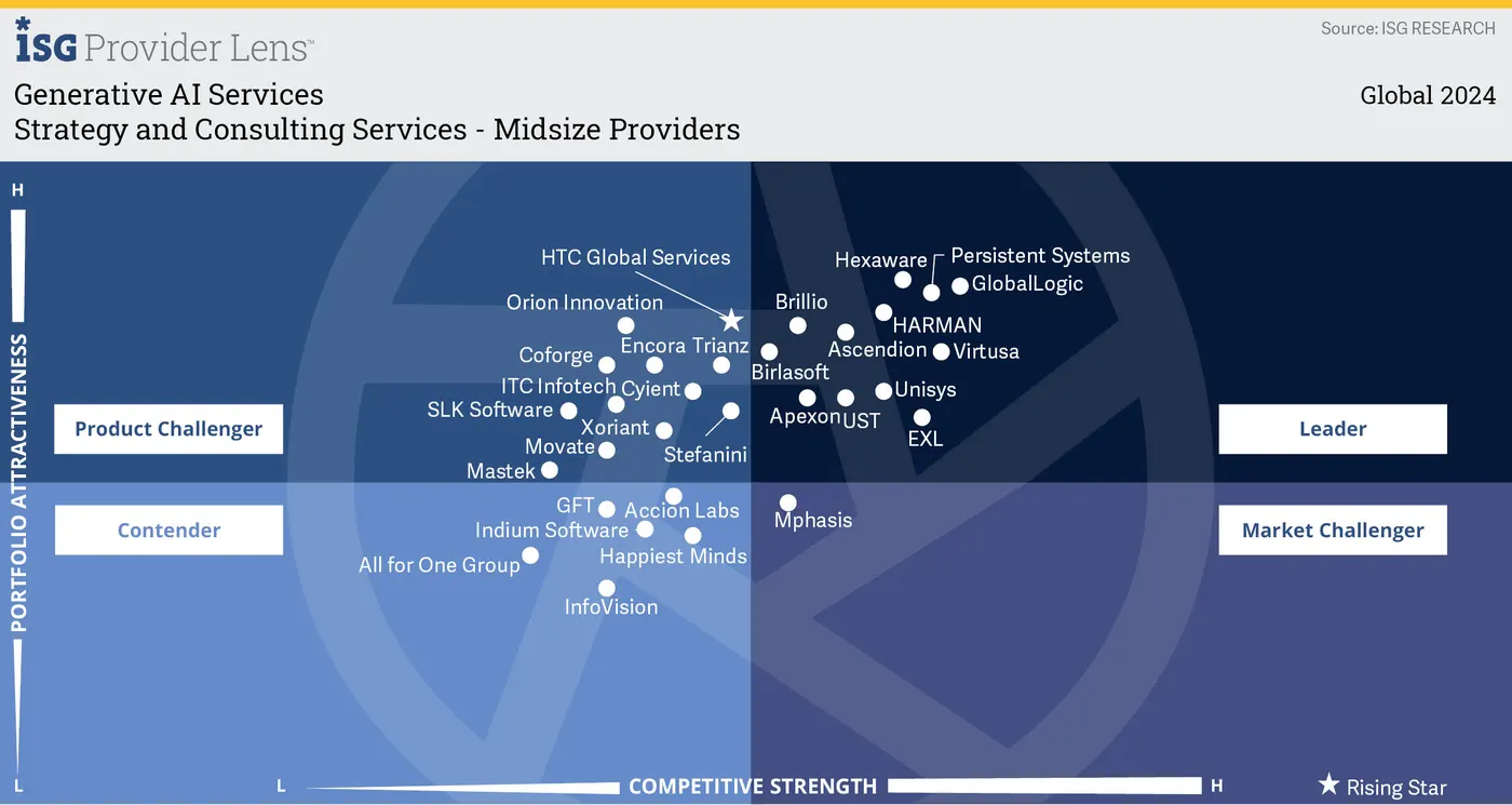 Spoločnosť GlobalLogic je podľa správy poprednej výskumnej a poradenskej inštitúcie zameriavajúcej sa na oblasť technológií Information Services Group (ISG) lídrom v oblasti služieb generatívnej umelej inteligencie. Potvrdzuje tým svoje výnimočné postavenie na trhu.