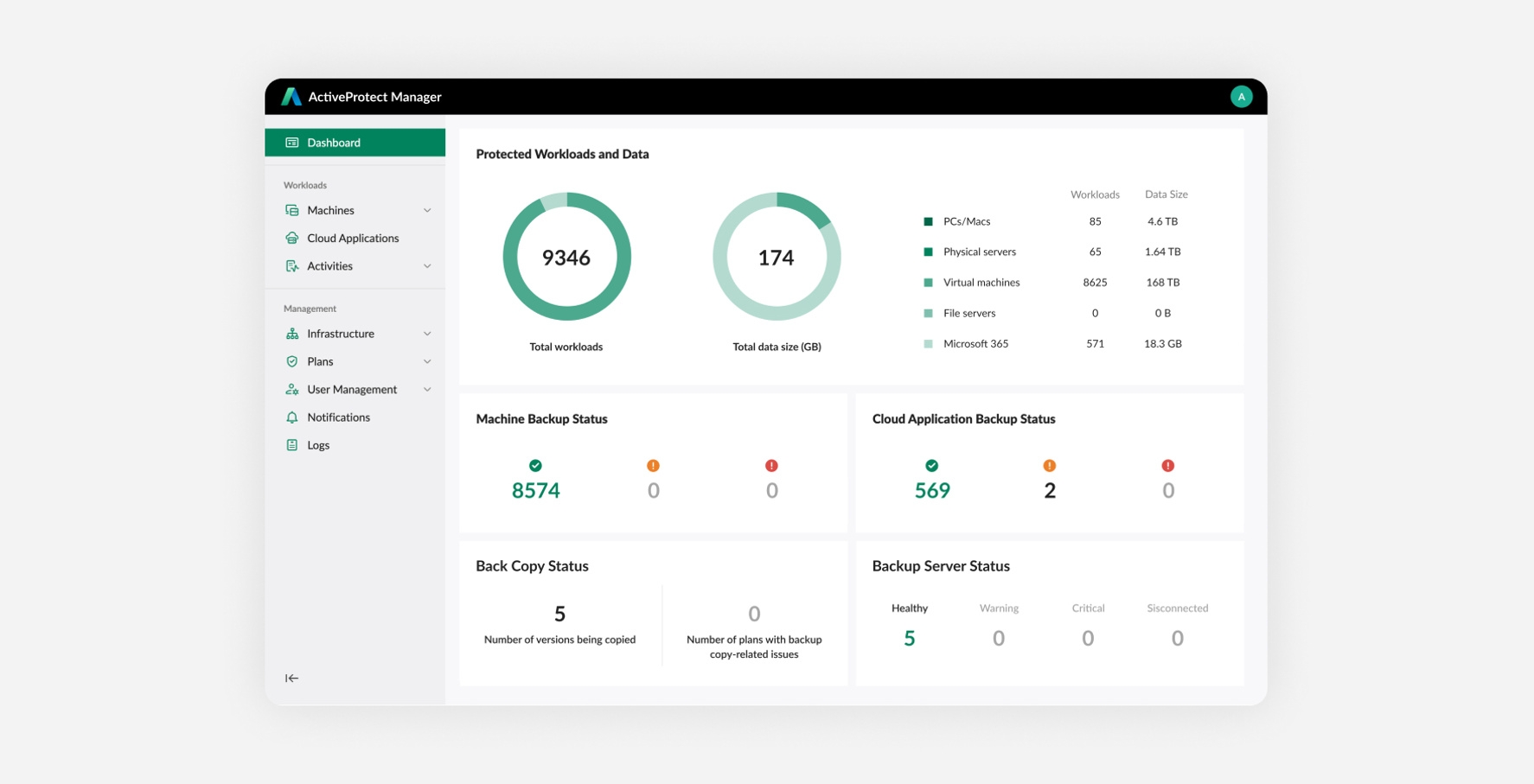 - Komplexní podpora pracovního zatížení: Chrání počítače PC, počítače Mac, souborové a fyzické servery, virtuální počítače, databáze a služby Microsoft 365 prostřednictvím jediného intuitivního rozhraní.
