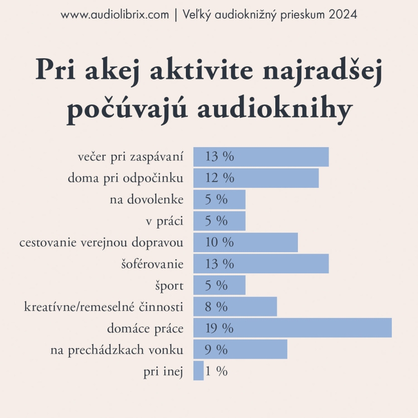 Audioknihy pomáhajú ľuďom viac čítať a sú neoddeliteľnou súčasťou každodenných činností. Z Veľkého audioknižného prieskumu, ktorý organizovala spoločnosť Audiolibrix, vyplynulo, že výber správneho titulu závisí predovšetkým od autora, anotácie a recenzií ostatných poslucháčov.