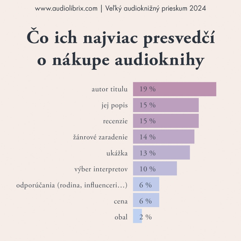 Nie je preto prekvapením, že recenzie sú jedným z najdôležitejších ukazovateľov pri výbere titulu na počúvanie (13 %). Ďalšími dôležitými faktormi sú autor titulu (15 %) a jeho anotácia (13 %).
