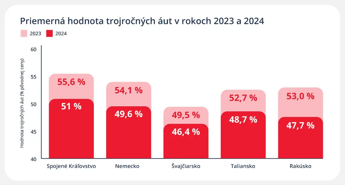 Mnohé z hlavných európskych trhov s ojazdenými automobilmi zaznamenali v roku 2024 klesajúci trend. Najnovšie dáta ukazujú, že ceny jazdených automobilov po troch rokoch klesli v roku 2024 o 5,6 % v Rakúsku, o 6,3 % v Taliansku a o 2 % v Nemecku. Európski odborníci na ceny automobilov z Autovista Group očakávajú, že v priebehu roka 2025 sa hodnoty trojročných vozidiel (do 60 000 km) znížia o ďalších 2,5 %.