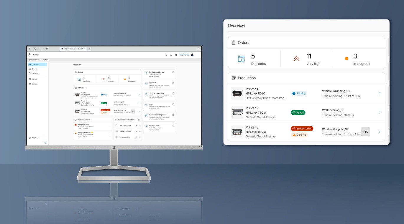 S uvedením HP PrintOS Production Hub majú teraz prístup k jedinému veľkoformátovému softvéru, ktorý kombinuje správu objednávok a vzdialené riadenie výroby do centralizovanej platformy v reálnom čase – čím zvyšuje efektivitu a znižuje prevádzkovú zložitosť.
