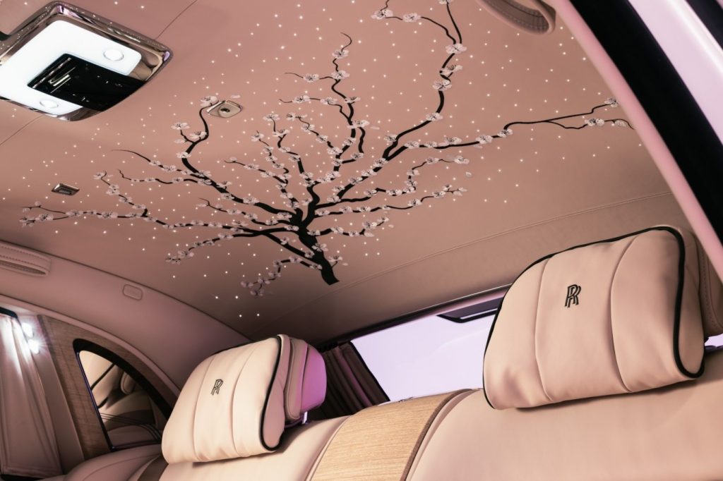 V interiér automobilu dominuje náročná komplexná výšivka, ktorá zachytáva pocit sedenia pod kvitnúcim stromom počas Hanami presne, ako si to klient predstavoval. Strop Bespoke Starlight Headliner zdobí vyšívaný konár čerešne obsypaný jemnými bielymi kvietkami. Motív pokračuje na obkladoch zadných dverí a na deliacej stene Privacy Suite medzi prednou a zadnou časťou kabíny vyšívanými padajúcimi lupienkami. Návrh a vývoj tohto jedinečného moderného umeleckého a remeselného spracovania trval viac ako šesť mesiacov, len vyšitie stropu s viac ako 250 000 stehmi si vyžiadalo tri týždne práce.