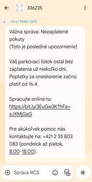 Národná agentúra pre sieťové a elektronické služby upozorňuje, že ide o podvodný typ správy a nie je zasielaný prostredníctvom slovensko.sk. Útočníci sa týmito krokmi snažia vzbudiť dôveru občanov a prinútiť ich k platbám prostredníctvom falošných platobných brán. NASES dôrazne odporúča, aby občania na žiadne podobné odkazy neklikali, nezdieľali žiadne citlivé informácie a nevykonávali žiadne platby.