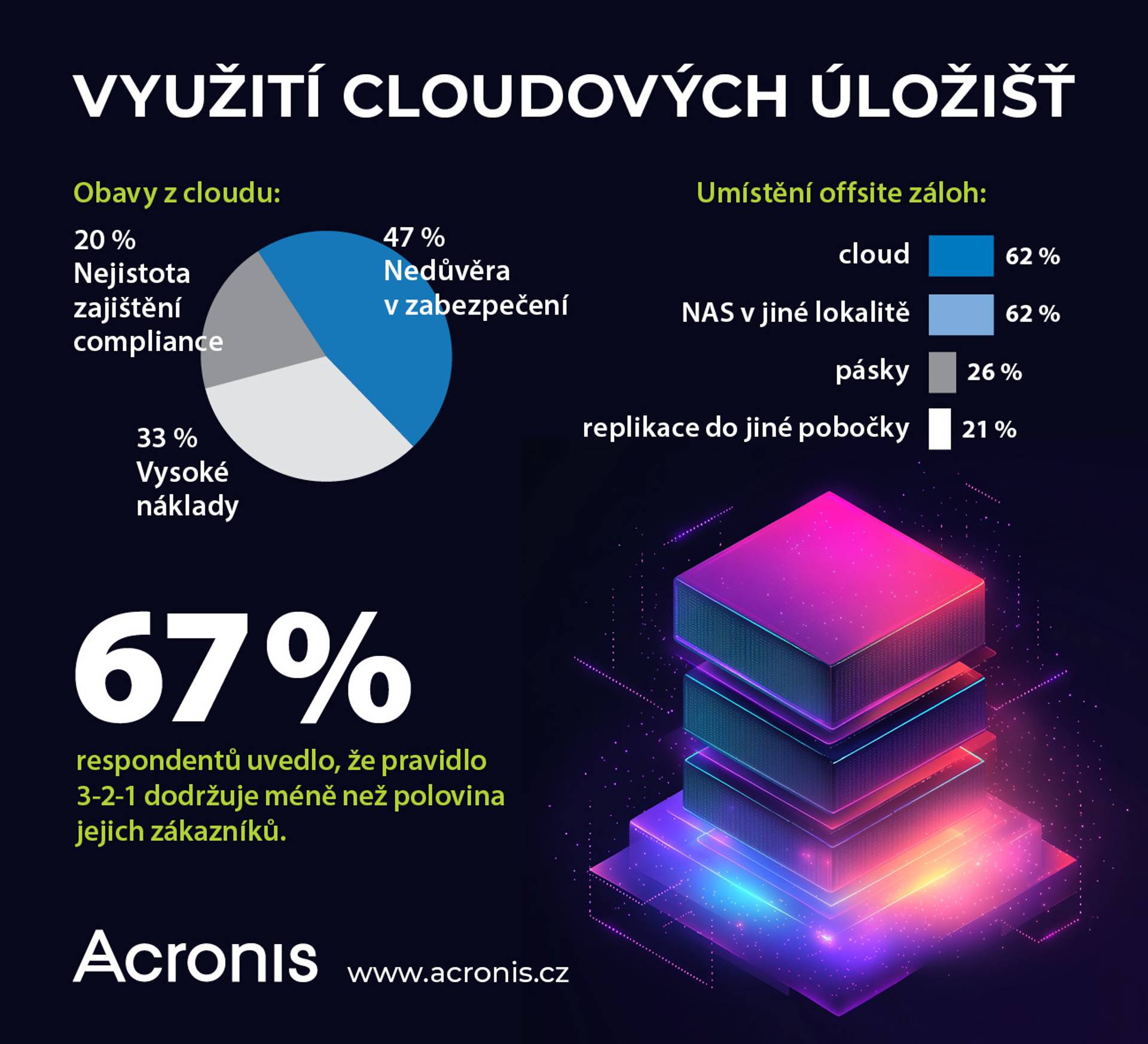 Acronis, globálny líder v oblasti riešení kybernetickej ochrany, predstavila výsledky prieskumu medzi svojimi českými a slovenskými IT partnermi o využívaní cloudových úložísk na zálohovanie firemných dát. Respondenti prieskumu uviedli, že ak ich zákazníci používajú na zálohovanie offsite úložisko, 62 % firiem už uprednostňuje cloudové úložisko. Prieskum však tiež ukázal, že stále významné percento organizácií nedodržiava vo svojich zálohovacích procesoch základné pravidlo 3-2-1, čím sa vystavuje potenciálne fatálnym problémom.