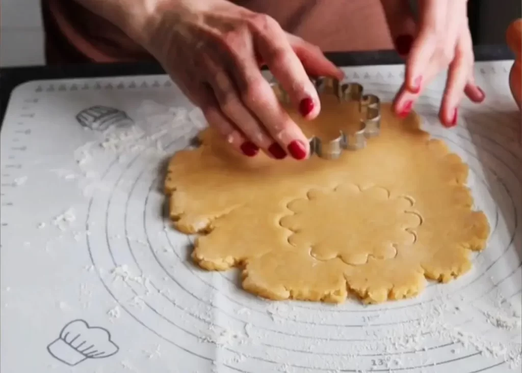 - Vychlazené těsto rozválejte na vyšší plát a vykrajujte kolečka či kytičky o průměru 10 cm.