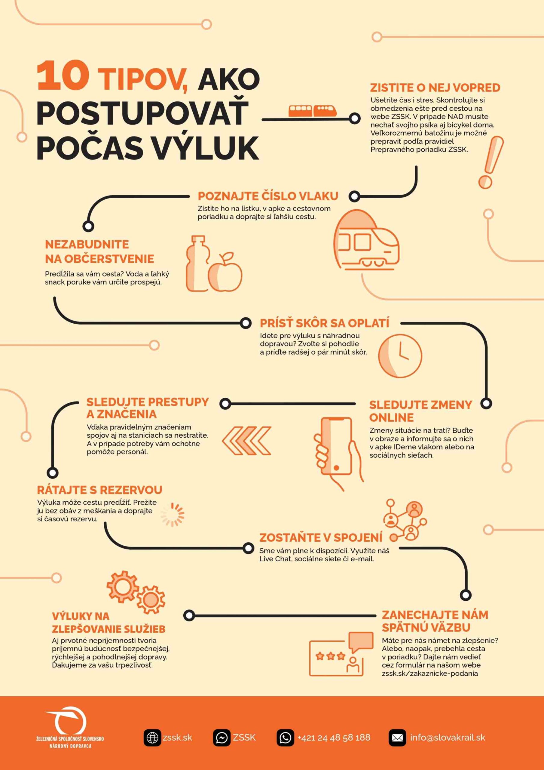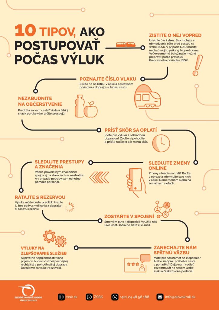 Na stránke ZSSK nájdete vždy aktuálny prehľad výluk a obmedzení. Pred cestou si skontrolujte, či sa výluka týka vášho vlaku. Môže ovplyvniť nielen čas odchodu, ale aj celkové trvanie cesty. Pri niektorých výlukách je časť trasy vlakov nahradená autobusovou dopravou (NAD). Informácie o trase NAD, náhradných zastávkach sú zverejnené na stránke ZSSK: