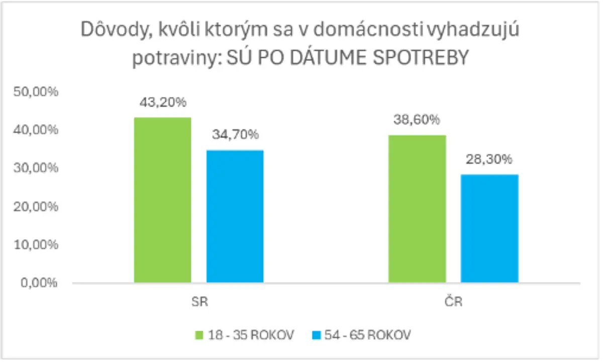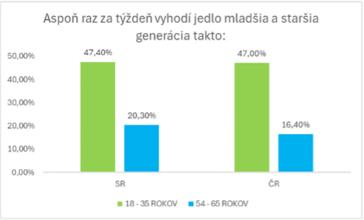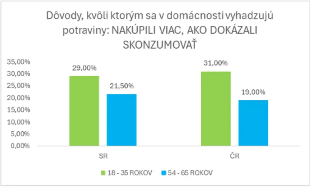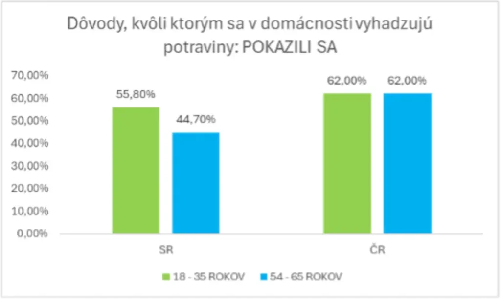 Podľa údajov z prieskumu jedlo zbytočne vyhadzuje aspoň raz týždenne až 47,4 percent Slovákov a 47 percent Čechov vo veku 18 – 35 rokov. V generácii 54 – 65 rokov ide len o 20,3 percent Slovákov a 16,4 percent Čechov. Najčastejším dôvodom sú pokazené potraviny, ktoré sa hromadia z dôvodu zlého plánovania a zbytočne veľkých nákupov. Uvádza to takmer 56 percent mladých Slovákov a 62 percent rovesníkov v Česku. Druhým najčastejším dôvodom vyhadzovania sú potraviny po dátume spotreby, pričom tento dôvod uvádza 43,2 percent Slovákov a takmer 39 percent Čechov z tejto vekovej skupiny. Prebytky z nadmerných nákupov priznalo 29 percent Slovákov a 31 percent Čechov do 35 rokov.